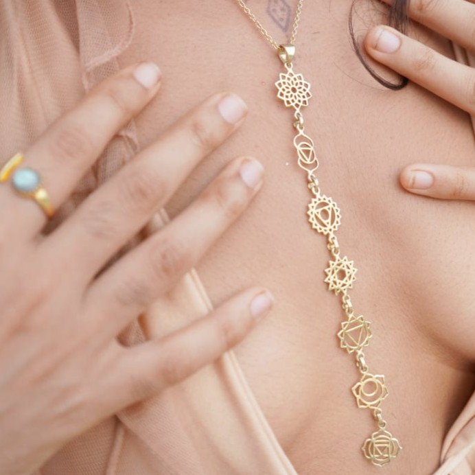 This Bar Seven Chakra Charms Necklace blends spiritual symbolism with modern minimalism, offering a contemporary way to wear the seven energies of the body. Crafted from solid brass and coated in a warm 22K gold plating, the necklace features a sleek horizontal bar from which seven delicate chakra charms are suspended. At 18 inches, it sits beautifully at the collarbone, creating a balanced and elegant silhouette. Handmade by artisans, this piece is perfect for women who value mindful jewelry with refined design.