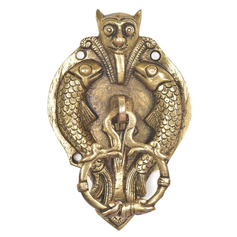 Brass Face door knocker made by expert craftsmen with two fishes with a knocker ring hanging beneath. The Brass door knocker has a brass ring that is banged on plate of the door knocker to produce the knocking sound. It can also be used as a towel ring and a gifting option for friends and relatives.