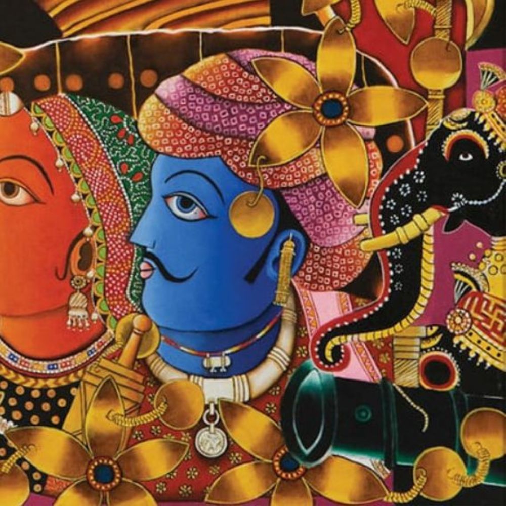 "Battle of Haldighati" is a magnificent Acrylic on Canvas painting that pays tribute to one of the most iconic battles in Indian history. The artwork vividly illustrates the legendary clash between Maharana Pratap of Mewar and the Mughal forces led by Akbar’s general Man Singh in 1576. Through striking colors, intricate details, and symbolic representation, the artist brings this historical moment alive on canvas. The painting is composed with dynamic energy - Maharana Pratap, astride his loyal horse Chetak, is depicted with valor and determination, holding his trident weapon with unmatched strength. On the other side, Man Singh, clad in regal armor and a golden crown, confronts him with equal might. The contrasting hues of green, red, blue, and gold add drama and highlight the emotional intensity of the battle. The foreground features noble warriors and adorned figures, representing courage, sacrifice, and heritage. Golden floral patterns frame the composition, infusing an element of cultural artistry that blends history with decorative elegance. This masterpiece not only narrates a tale of war but also glorifies the spirit of resistance, bravery, and pride of Rajputana. An ideal piece for history enthusiasts and collectors, it embodies grandeur and cultural richness.