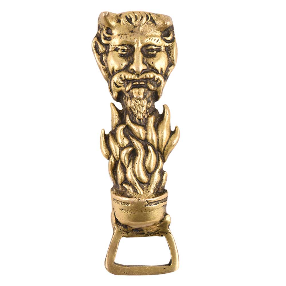 A Very Decorative Brass Tribal Head Rests on the Bottle Opener Gives a Vintage Look to Your Bar Counter. The Bearded Face Over A Fire Torch Bottle Opener is Used to Pull the Sealed Cover of Wine Bottle, Soda Bottle, Coke Bottles, Juice Bottles and Small Glass Bottles Containing Flavored Milk.