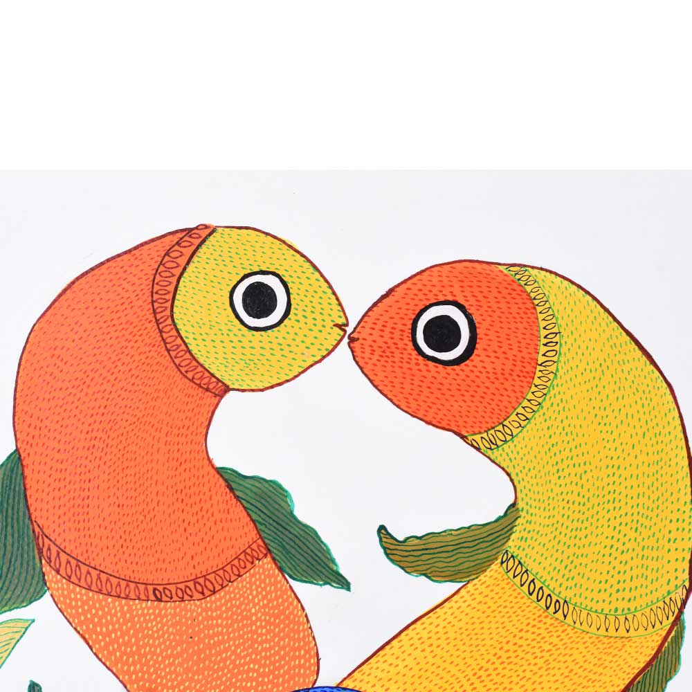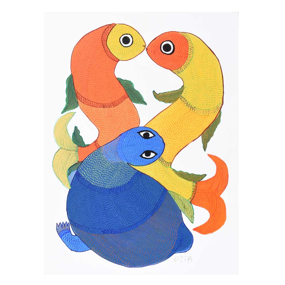 - Features a turtle and two fish, depicted in intricate patterns and vibrant colors typical of Gond Art.