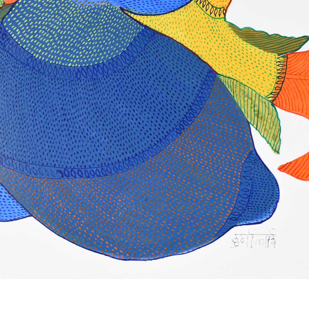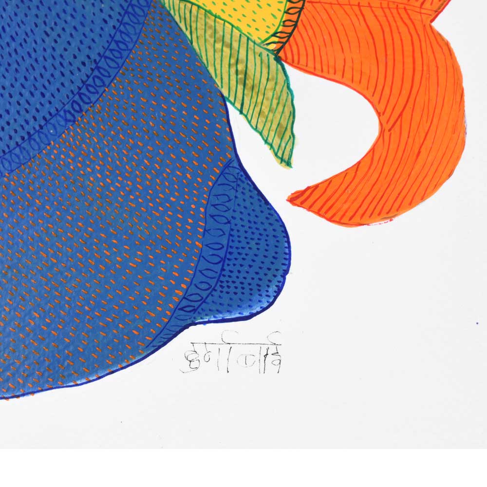 This captivating Gond Art acrylic painting on paper by Durgabai Vyam presents a serene scene of a turtle accompanied by two fish, masterfully crafted with intricate patterns and vivid colors without frame. The turtle, a symbol of wisdom and longevity, is adorned with geometric shapes and vibrant hues that bring its form to life. The two fish swim gracefully alongside, their scales beautifully rendered with organic patterns and rich, contrasting colors. Durgabai’s use of acrylics enhances the textural richness of the painting, allowing each animal to emerge from the page with a sense of motion and vitality. This artwork reflects the Gond tribe’s deep reverence for nature and wildlife, capturing the harmony of aquatic life in a timeless, symbolic manner. Durgabai Vyam is a renowned Gond artist from Madhya Pradesh, celebrated for her skill in preserving and modernizing the traditional Gond Art style. Her paintings are known for their intricate detail, vibrant colors, and symbolic representations of nature. In recognition of her contributions to the art world, Durgabai was awarded the Padma Shri in 2022. Her works continue to inspire art lovers and educators, serving as a bridge between ancient tribal traditions and contemporary artistic expressions.