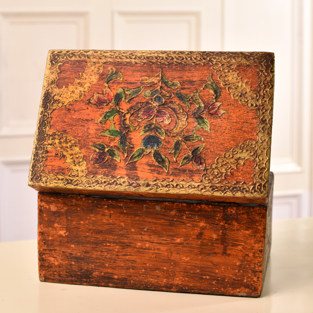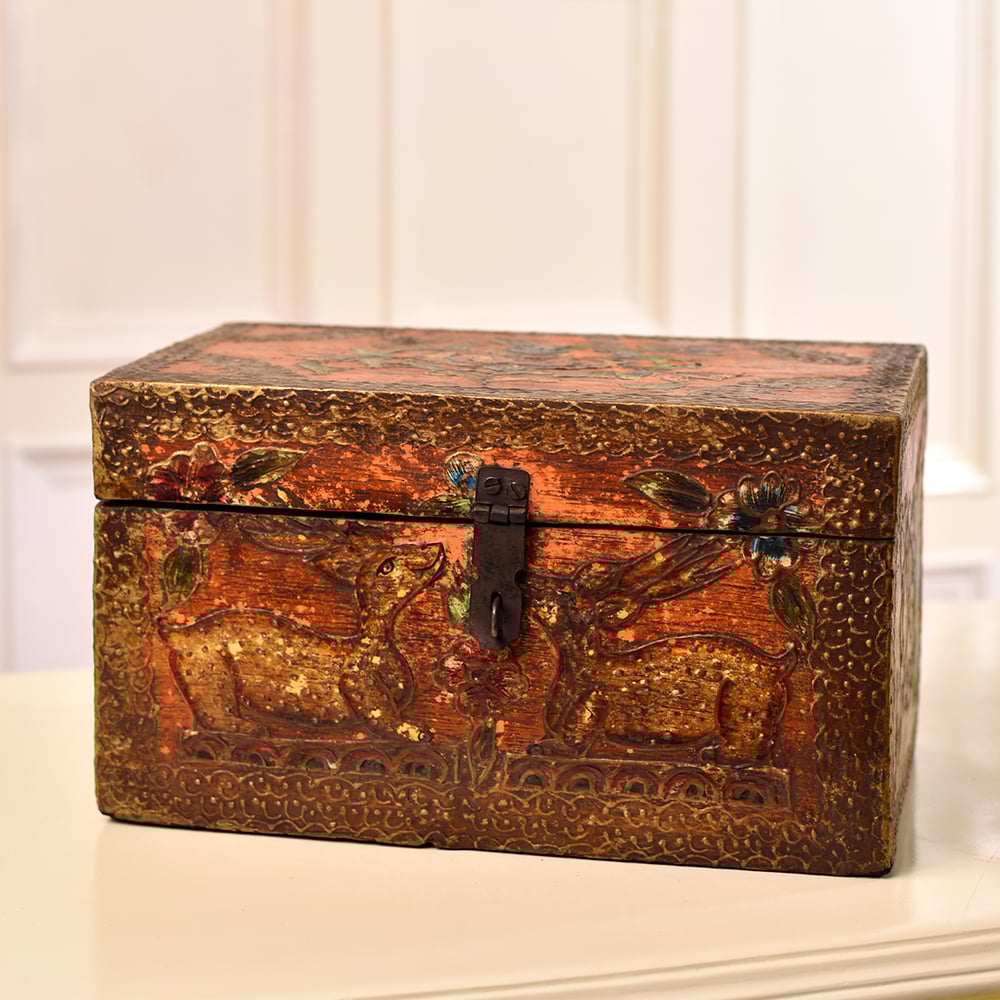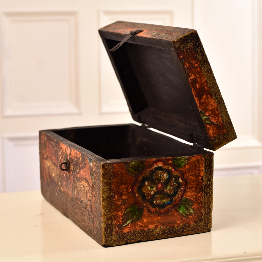 Enhance your home decor with the exquisite craftsmanship of our Handmade Indian Artisan Wooden Box. This stunning box is a testament to the skill and artistry of Indian craftsmen, who have meticulously carved intricate animal and beautiful designs onto its surface. The rich, antique brown finish lends it a timeless, antique charm, making it a true work of art. Crafted from high-quality wood, this box is not only a visually captivating piece but also a versatile storage solution. With a sturdy latch, it securely holds your most precious possessions, serving as an elegant jewelry box. Its generous interior allows for safekeeping of small items like trinkets, keepsakes, or even letters. Not just functional, this wooden box is a conversation starter. Its beauty and craftsmanship make it a delightful addition to your home decor or a standout exhibit at an art show. It's a thoughtful and sentimental gift, perfect for special occasions and festive celebrations, allowing you to share the artistry of skilled Indian artisans with your loved ones.