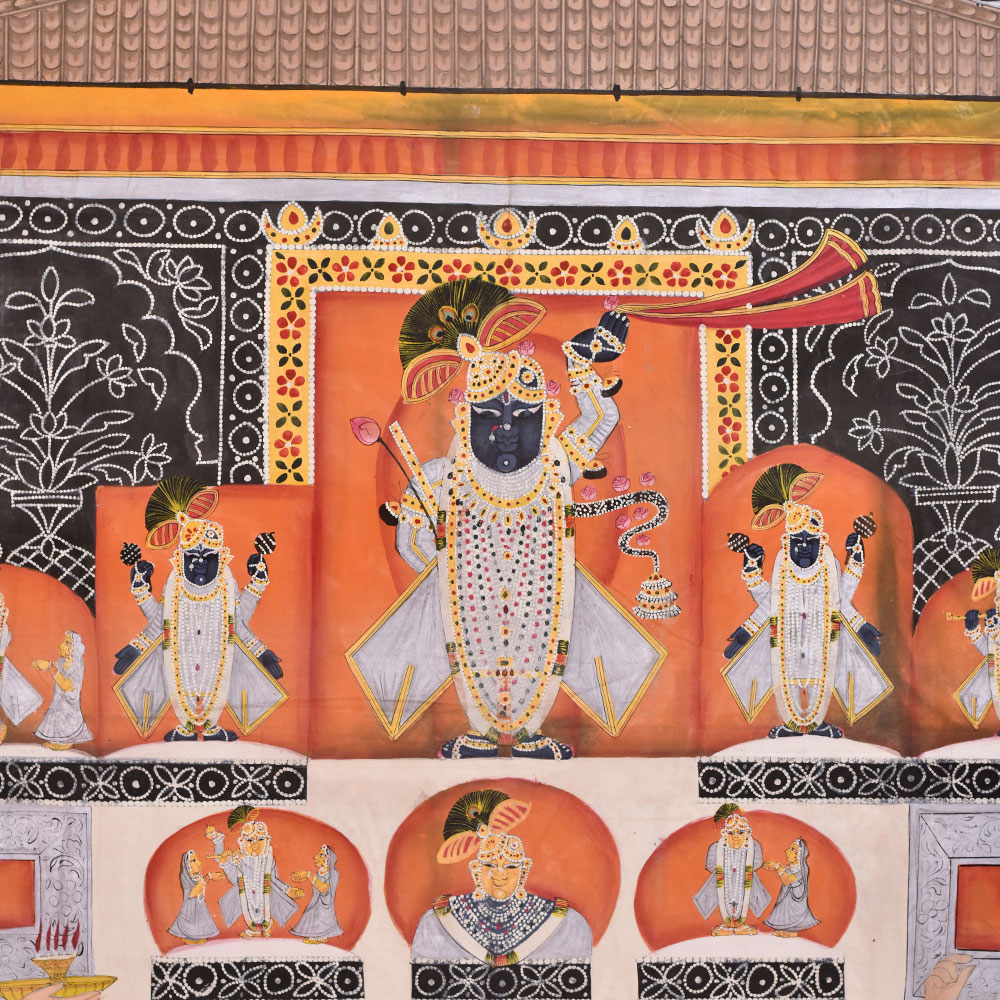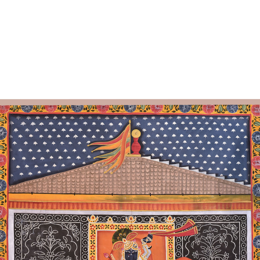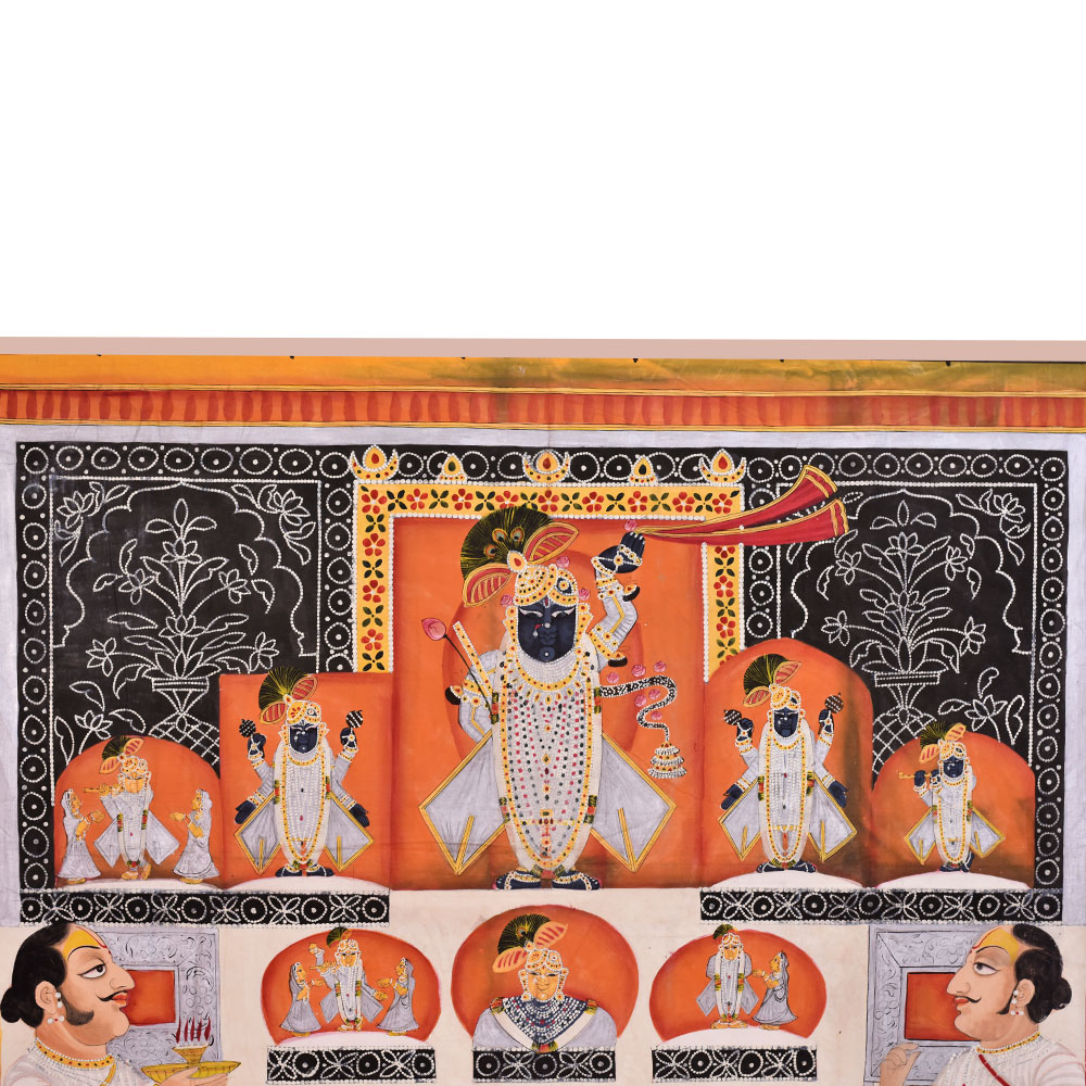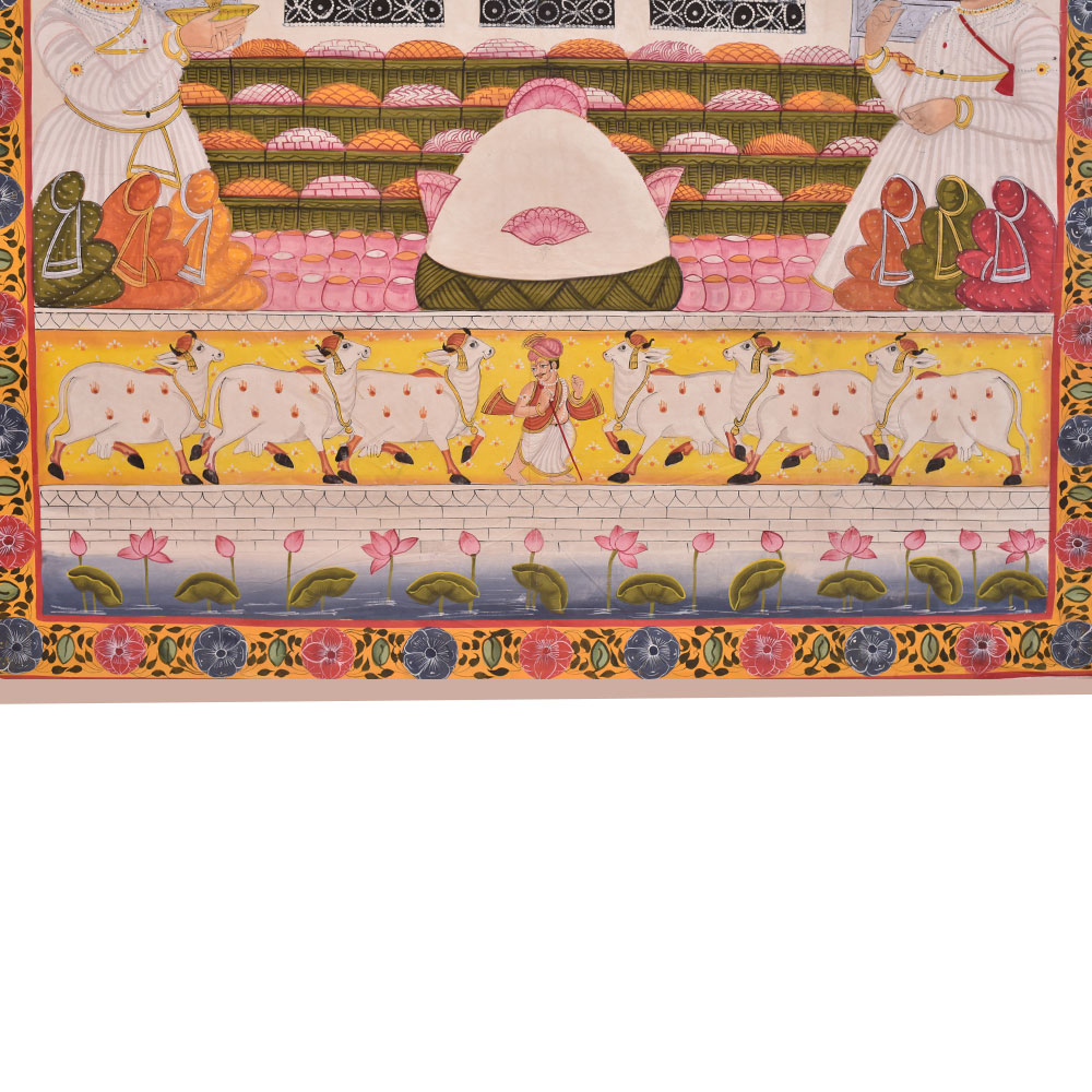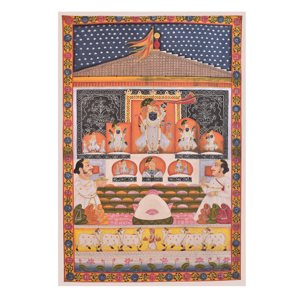 Buy a pichwai painting that is a stunning depiction of Lord Shrinathji and Lord Krishna in a temple. The intricately painted image shows the two deities in vivid detail, surrounded by intricate floral border. The use of multi-colours by professional Indian artists adds a mesmerizing touch to the painting, making it a work of art that is sure to captivate the attention of anyone who gazes upon it. In the foreground of the painting, two saints can be seen praying, adding a spiritual depth to the artwork. The combination of the religious icons and the serene ambiance makes this painting perfect for hanging in prayer rooms or temples. This pichwai painting is an ideal gift for family, friends, and relatives for special or festive occasions. It is a unique and auspicious gift that is sure to bring peace, prosperity, and blessings to the recipient's life. The level of detail and the skilled craftsmanship involved in creating such a work of art is truly impressive, making it a timeless addition to any home or place of worship.