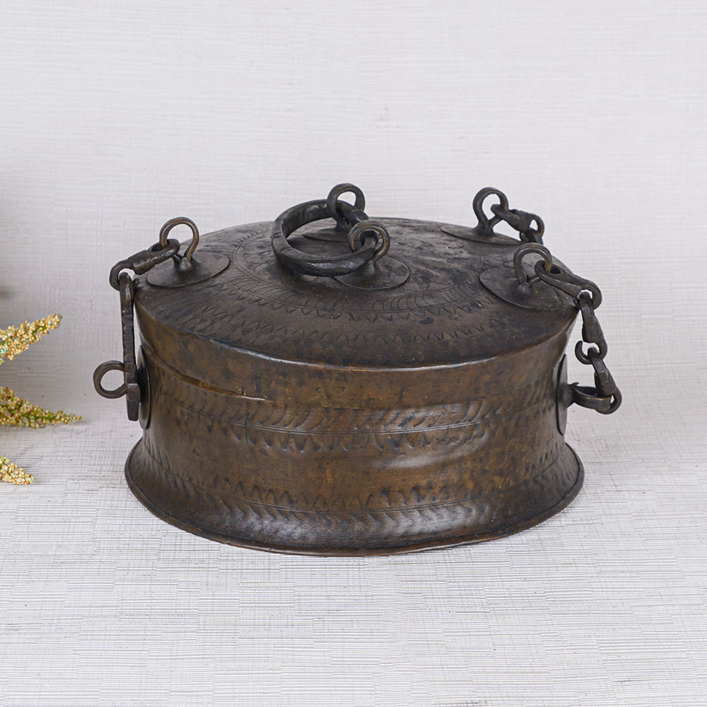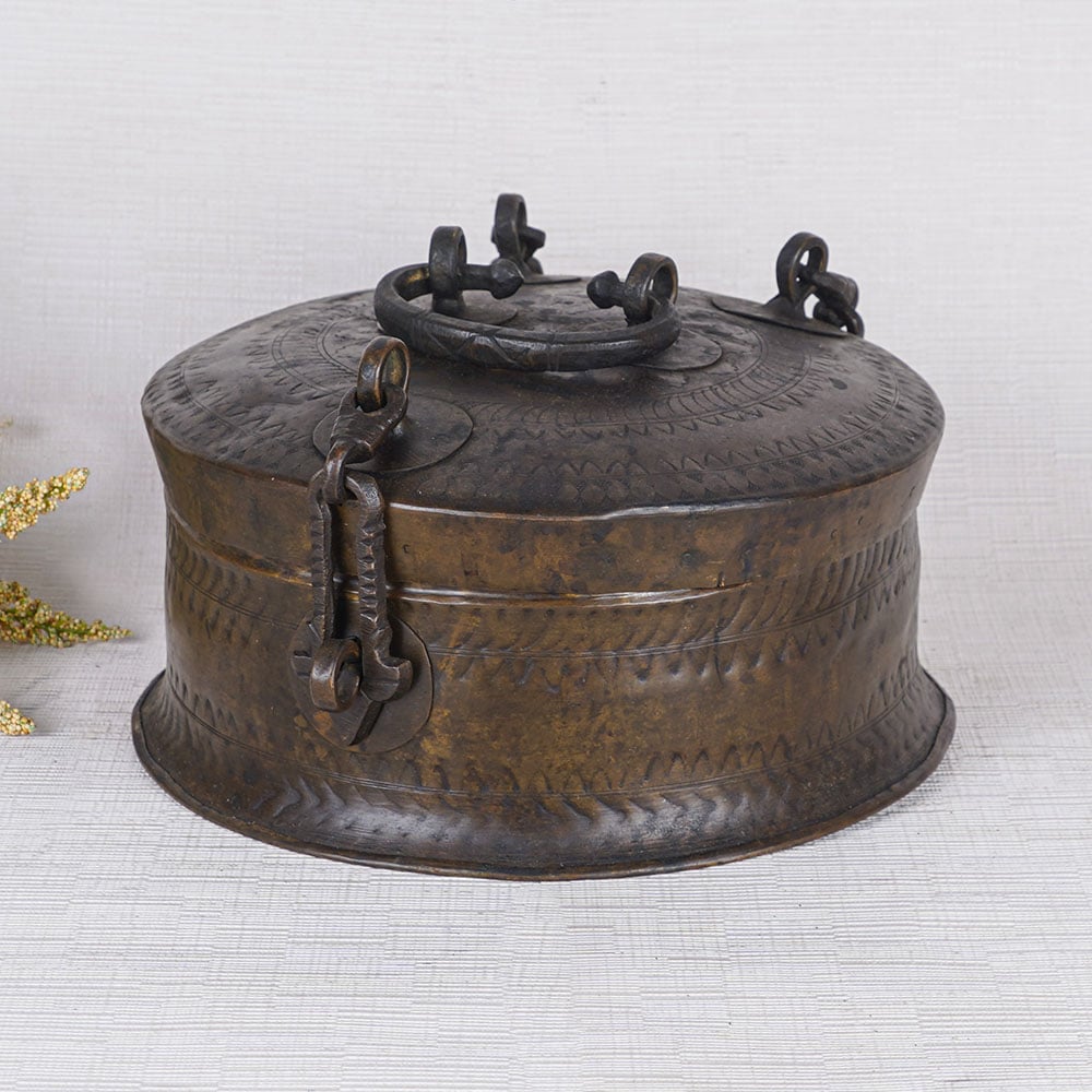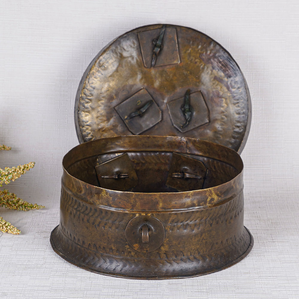 The handcrafted brass jewelry box is an incredible piece made with utmost precision and traditional methods by skilled Indian craftsmen. Crafted from high-quality brass, it features a rich dark brown finish that exudes elegance. Designed to safeguard precious items and jewelry, this versatile box is now an ideal storage solution for jewelry and precious stones. Engraved with intricate and beautiful designs, the box showcases the craftsmanship and attention to detail. It is equipped with a sturdy latch for secure locking and a convenient handle on the top for easy portability. Whether placed in a home, office, restaurant, or hotel, this jewelry box adds a touch of sophistication to any space. With its timeless charm, the brass round jewelry box is not only functional but also makes for a remarkable exhibition or museum display. Moreover, it serves as a perfect gift for family, friends, or relatives on special or festive occasions. This jewelry box for girls is a must-have for those seeking a unique and exquisite storage solution, particularly for earrings.