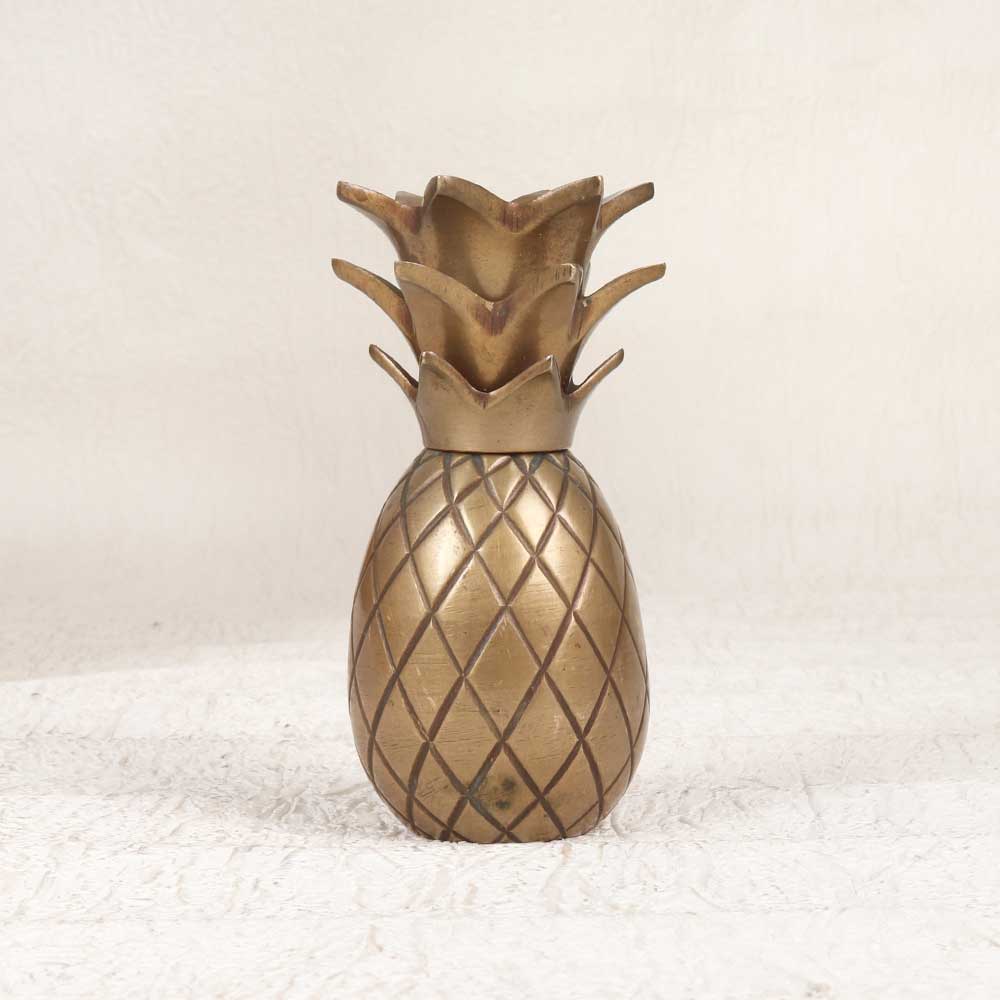 Illuminate your home with tropical flair using the Brass Pineapple Candle Holder. This vintage-inspired accent piece adds a touch of paradise to any space. The intricately detailed, solid brass pineapple sculpture provides a sturdy base for a standard taper or pillar candle. Place it on a console table, mantel, or dining table to infuse your decor with a sense of warmth and whimsy. The handcrafted vintage design evokes feelings of an island getaway. This charming candle holder is perfect for anyone looking to add a little personality and nostalgic charm to their living space. The vintage styling provides a one-of-a-kind statement that feels uniquely you. Illuminating this brass pineapple creates a cozy glow, ideal for relaxing evenings at home. Make your home an oasis and bring the tropics to you with this beautiful candle holder.