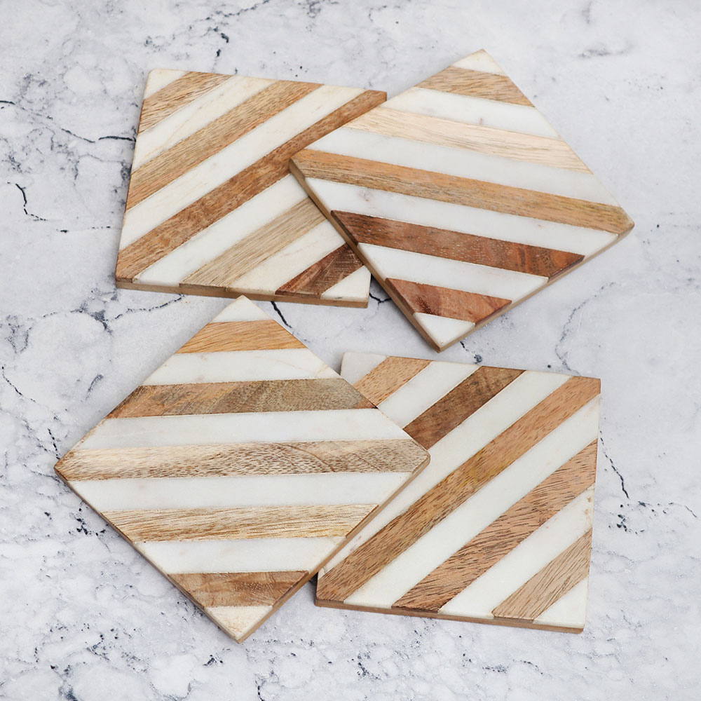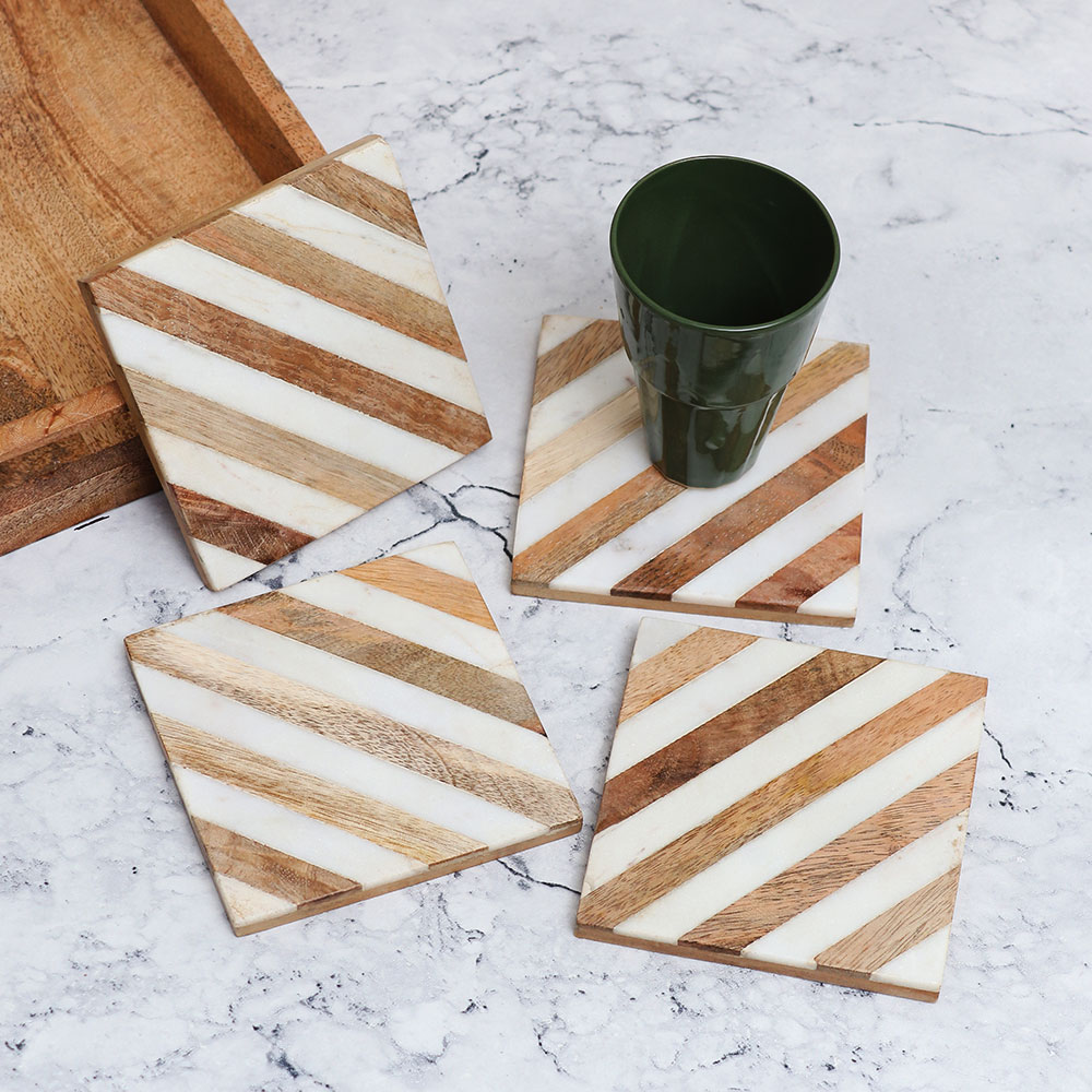Indianshelf.com for bulk/wholesale orders.Indianshelf.us for personal purchases.Enhance your home decor while safeguarding your furniture with these Beautiful Brown and White Wooden Coasters. This set of four coasters features a chic brown and white color scheme, providing both functionality and style. Ideal for tea, coffee, or any drink, these coasters bring a touch of elegance to any environment, making them perfect for everyday use or special gatherings.