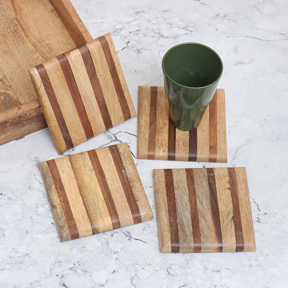Buy an exquisite Wooden Tea Coaster Set that is a perfect blend of elegance and functionality. Handcrafted from high-quality wood, this Pack of four square-shaped coasters showcases the impeccable artistry of professional Indian artisans. The coaster set features a stunning antique brown finish pattern, lending a timeless charm to any space. Not only does it serve as a practical accessory to hold water, tea, juice, or coffee glasses, but it also acts as a captivating decorative piece for your home or office. Place it on your coffee table, dining table, or desk to add a touch of sophistication and protect surfaces from unsightly stains. Versatile and durable, this wooden tea coaster set is suitable for various settings, be it your home, office, restaurant, hotel, or cafe. Moreover, it makes for an ideal gift for your loved fours on special or festive occasions, allowing them to relish both the aesthetic and practical aspects of this exquisite creation.