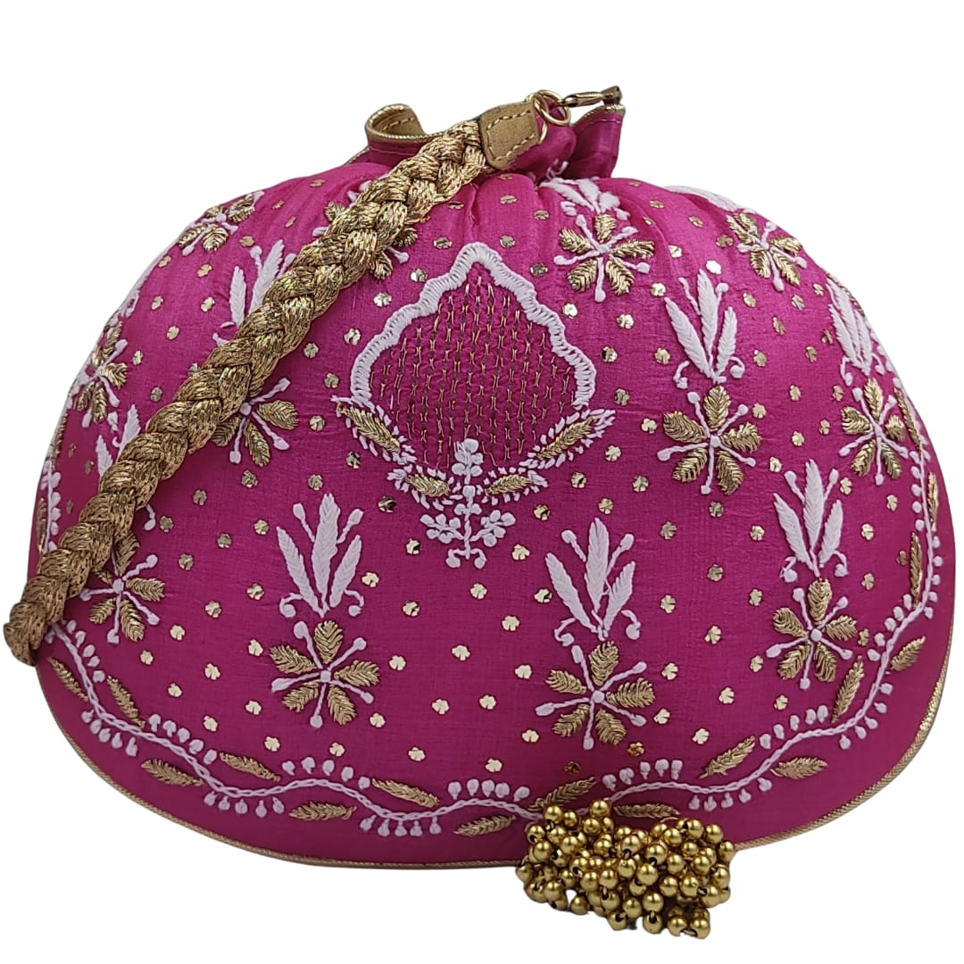 Make a bold and beautiful statement with this eye-catching handcrafted potli bag, made from premium tussar silk in a rich fuchsia pink (rani pink) hue. Featuring exquisite Chikankari embroidery on both sides, this bag is further elevated by intricate mukaish work that adds a festive golden sparkle. The combination of white and gold thread in the floral and central motifs creates a stunning contrast against the vibrant base. Finished with a durable braided golden handle and a drawstring closure, the potli is adorned with golden pearl tassels on both ends—offering elegance in every detail. Lightweight and compact, yet spacious enough for your essentials, it is perfect for weddings, festive gatherings, or traditional functions. Whether styled with sarees, lehengas, or Indo-western attire, this vibrant potli bag enhances any look with a graceful yet bold flair. A must-have accessory for lovers of timeless craftsmanship and rich color.