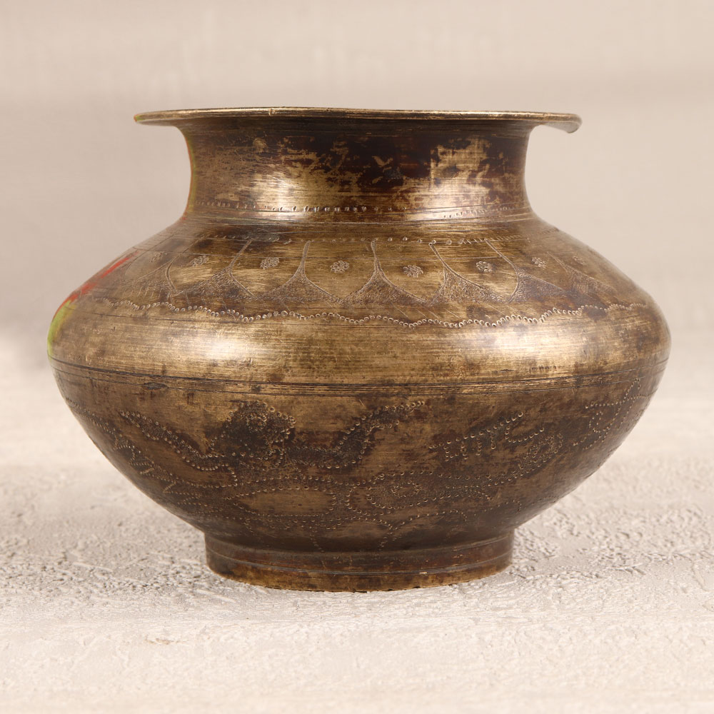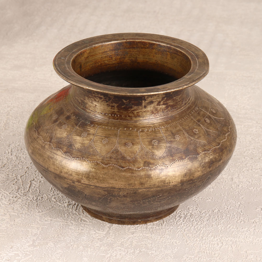 Adorn your interior with the timeless elegance of this Vintage Brass Holy Water Pot from the artisans of Himachal Pradesh, India. Meticulously handcrafted with intricate carvings, this lota embodies the rich cultural heritage of the region. Made from high-quality Brass, the antique brown finish adds a touch of authenticity and warmth, making it a cherished piece for prayer, havan, and auspicious occasions. Versatile in its use, the pot graciously holds holy water during rituals and serves as a charming vessel for flower decorations. Crafted by skilled Indian artisans, this piece is a testament to their dedication and expertise. Beyond its spiritual significance, the pot doubles as a striking decorative item suitable for any setting - be it home, office, restaurant, hotel, or cafe. Its antique allure makes it a valuable addition to any vintage collection, while its enduring charm makes it an ideal gift for loved ones on special, festive, or auspicious occasions.