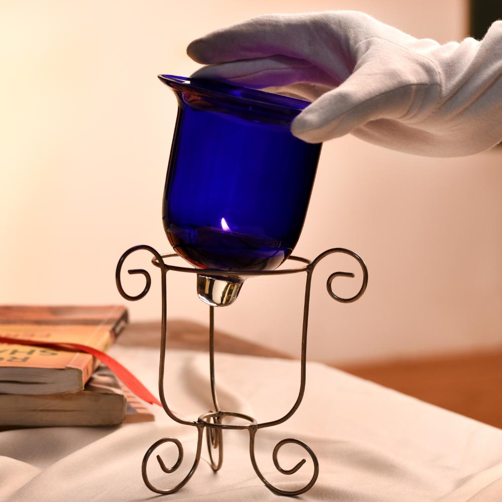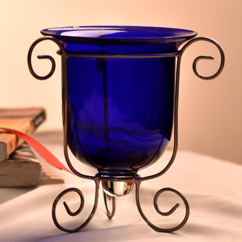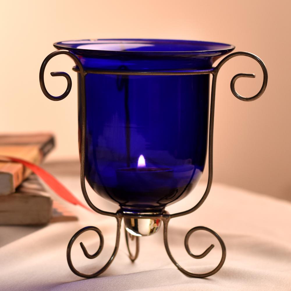 Buy a handmade glass tea light holder in a captivating blue shade that is expertly crafted by talented Indian artisans using premium quality glass. This decorative candle holder features transparent glass that radiates a soothing glow when the tea light is illuminated. The elegant black stand adds a touch of modern sophistication, creating a striking contrast that enhances any space. Designed for versatility, this beautiful candle holder seamlessly complements various settings, making it a perfect addition to your home, office, restaurant, hotel, or cafe. Elevate your dining experience with its enchanting ambiance, setting the stage for memorable moments on special occasions. The intricate craftsmanship and attention to detail make this piece a unique and stylish choice for enhancing interiors. Gift your loved ones a touch of elegance with this modern candle holder, an ideal present for special, festive, or auspicious occasions. Whether adorning your space or shared as a thoughtful gift, this glass tea light holder is a symbol of craftsmanship, beauty, and the warmth of shared moments.