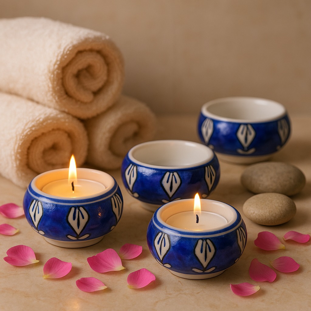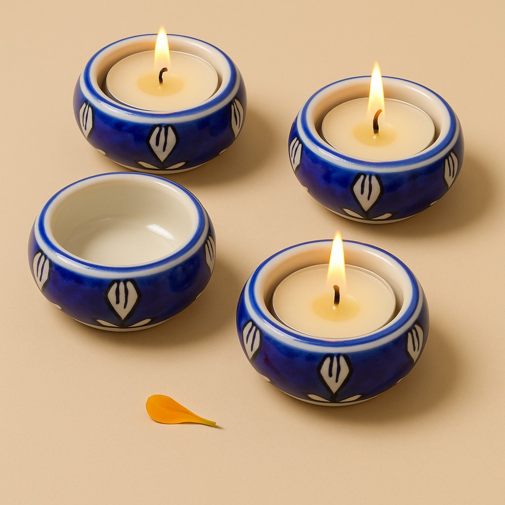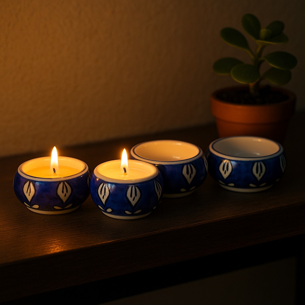 Indianshelf.com for bulk/wholesale orders.Indianshelf.us for personal purchases.This beautiful set of 4 handmade ceramic tea light holders brings a delightful charm to any environment. Skillfully crafted by artisans, these holders are ideal for creating a warm and inviting ambiance. Their unique design showcases intricate ceramic artistry that enhances your home's beauty while casting a soft, glowing light.