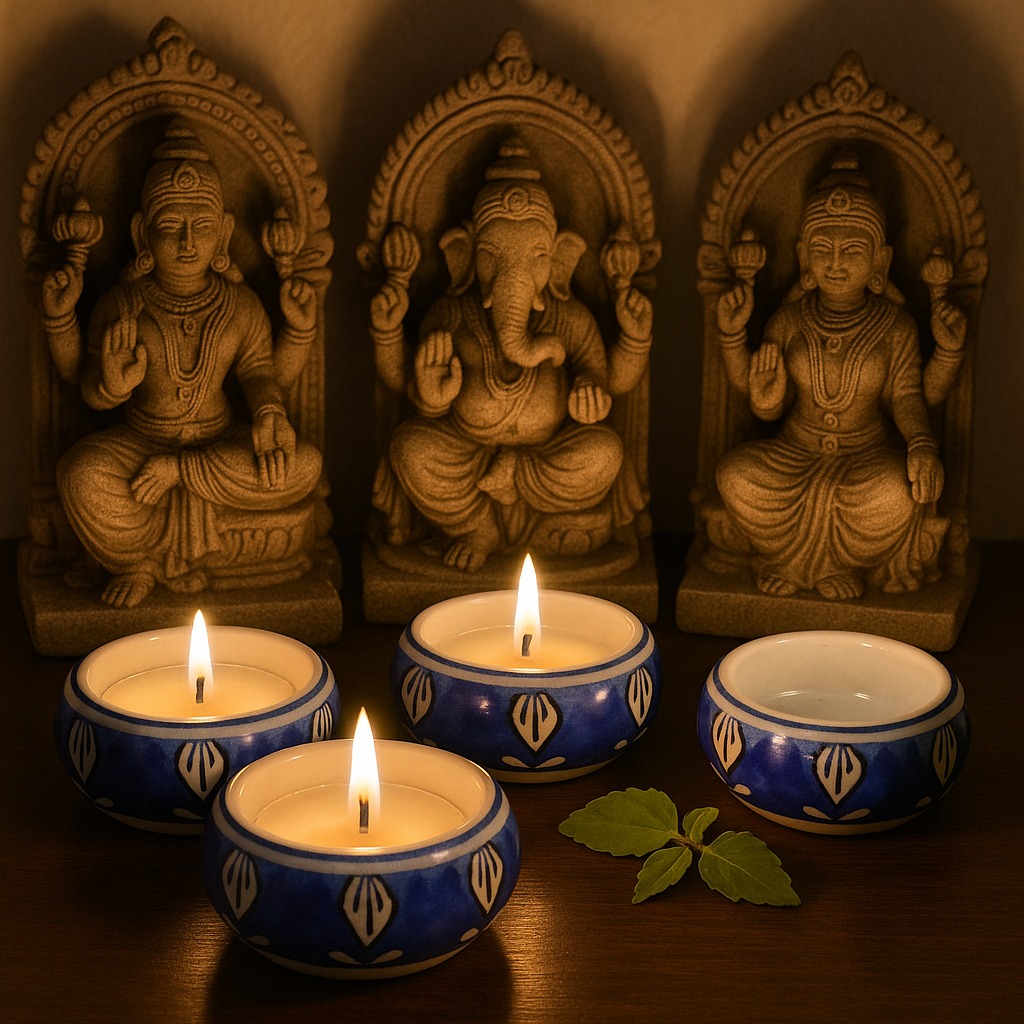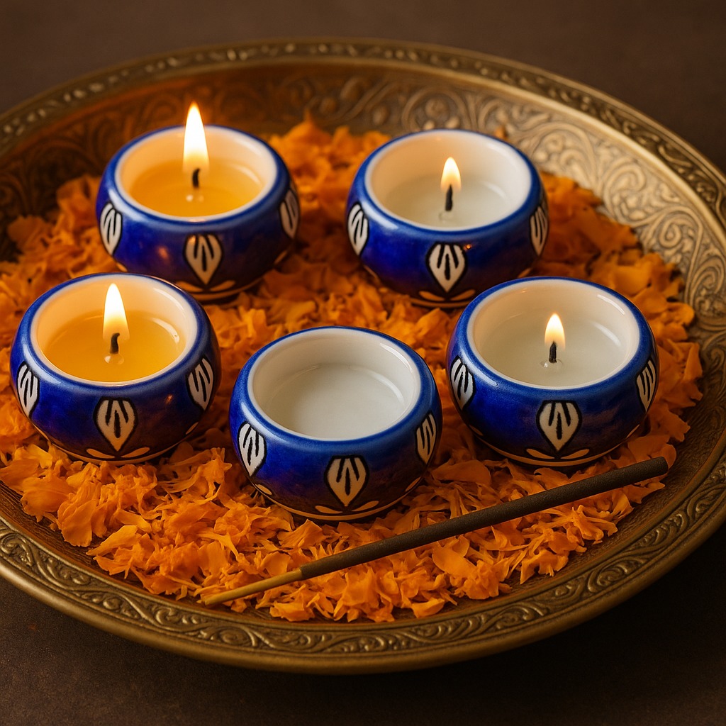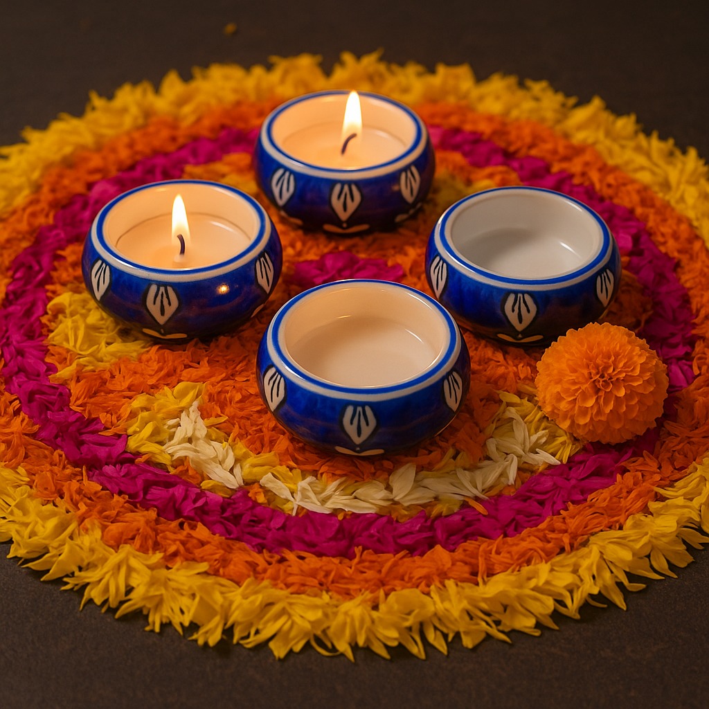 Indianshelf.com for bulk/wholesale orders.Indianshelf.us for personal purchases.This beautiful set of 4 handmade ceramic tea light holders brings a delightful charm to any environment. Skillfully crafted by artisans, these holders are ideal for creating a warm and inviting ambiance. Their unique design showcases intricate ceramic artistry that enhances your home's beauty while casting a soft, glowing light.