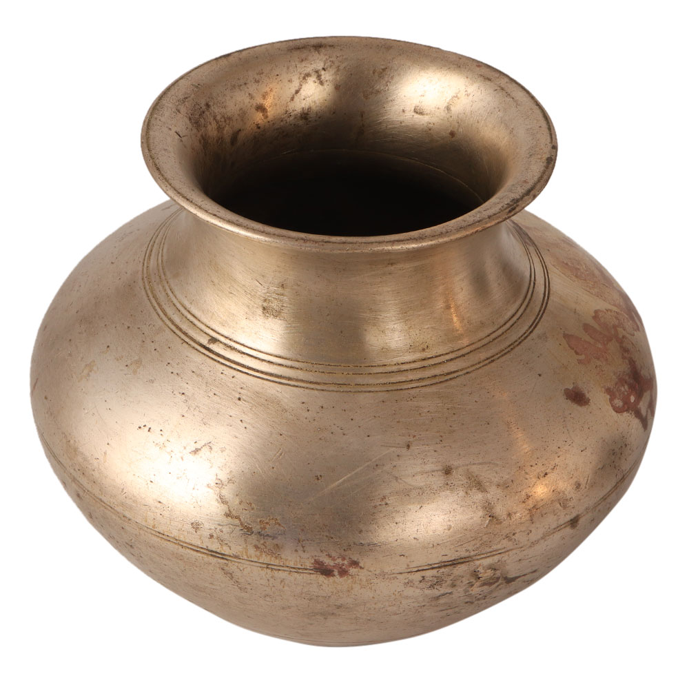 A beautiful Gangajal pot is handmade by skilled local workers in northern India. It has a flat bottom to stay on the surface and circular rings engraved on the sides. It is made of white metal alloy. You can use it for morning sun prayer. It is believed that offering water to the sun in the morning helps balance the mind and spirit.