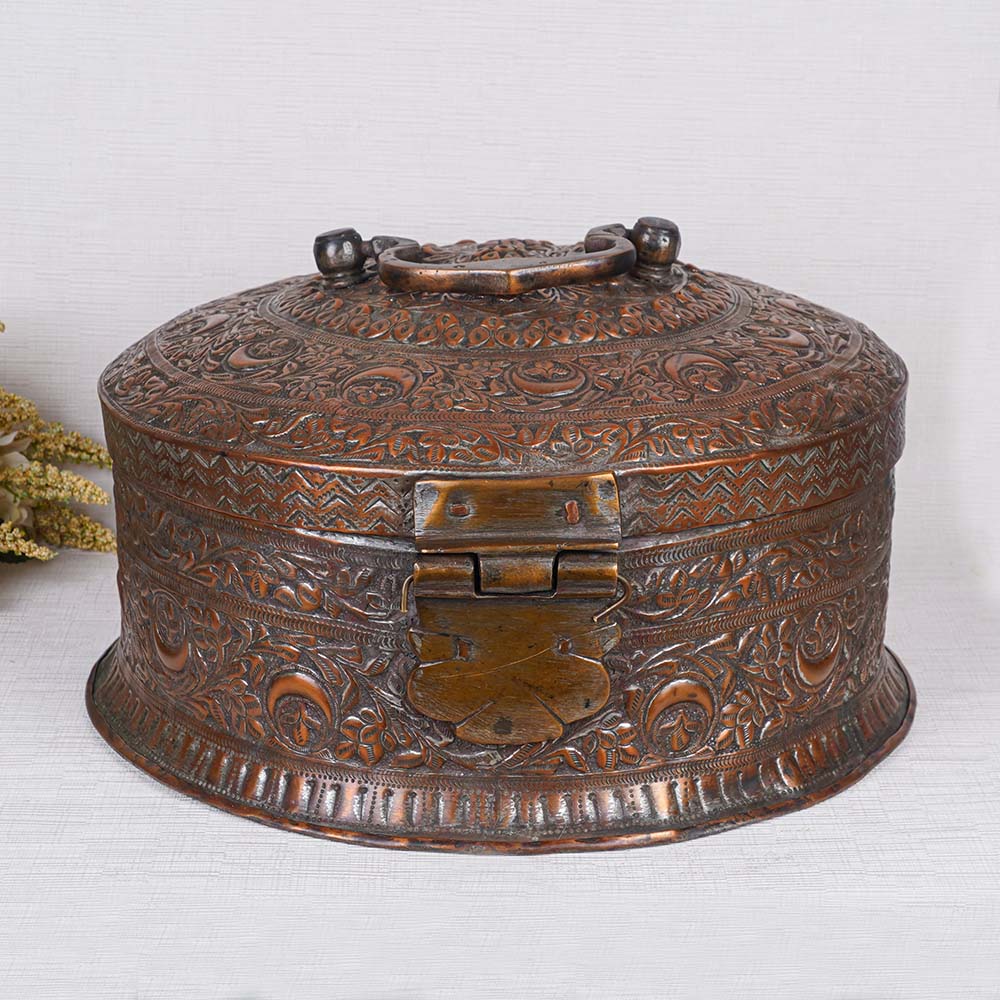 Buy a brass Paan Daan online that is a true masterpiece crafted with passion and skill by expert Indian artisans. This elegant piece showcases stunning floral and leaf designs, intricately hand-carved, and finished in an antique brown hue. With its timeless beauty, it seamlessly blends traditional artistry with contemporary aesthetics. Featuring six compartments inside, this Paan Daan serves as a functional storage solution for various Paan ingredients. Its top handle and secure latch ensure convenience and ease of use. This versatile piece effortlessly enhances the ambiance of any setting, be it your home, restaurant, hotel, cafe, or office. Its striking appearance makes it equally suitable for exhibitions or museums, captivating visitors with its cultural charm. Moreover, the Brass Round Paan Daan makes for an extraordinary gift on special occasions or festive celebrations. Its impeccable craftsmanship and rich heritage make it a cherished token of affection for your loved ones. Delight in the beauty and utility of this remarkable creation, a testament to the fine artistry of Indian craftsmanship.