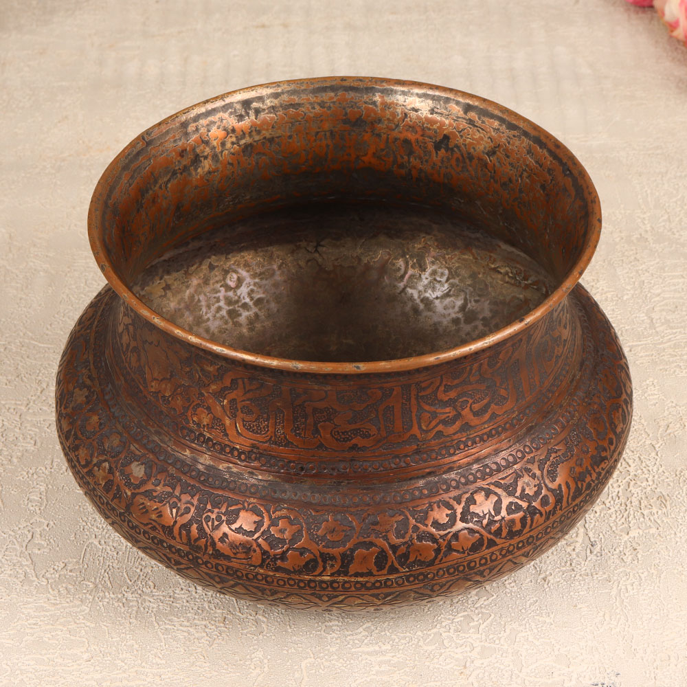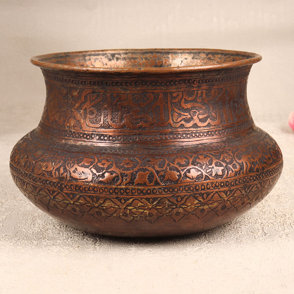 Buy a Vintage Copper Pot online that is a timeless masterpiece crafted by highly skilled Indian artisans in the intricate tradition of Islamic Art. Handmade with meticulous precision, this planter showcases stunning engravings that narrate tales of craftsmanship and cultural heritage. The rich, antique dark finish adds a touch of opulence, making it a striking addition to any setting. Made from high-quality copper, this pot serves as a versatile decor piece that transcends boundaries. Its functionality extends beyond its aesthetic appeal – doubling as a unique planter. Ideal for homes, offices, restaurants, hotels, or cafes, this versatile piece effortlessly blends into diverse environments, adding an aura of sophistication. Elevate your surroundings with a piece that embodies the essence of vintage charm. A thoughtful gift for special, festive, or auspicious occasions, this Vintage Copper Pot is a symbol of artistry and tradition.