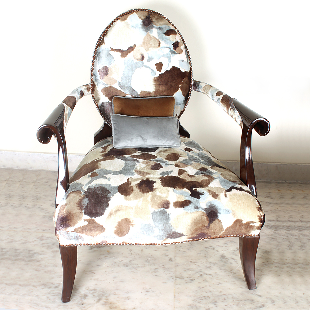 An outstanding beautiful teardrop armchair with arms carved from indian teak to give a rolled paper appearance.This Particular versions Features Individual Brass studs ,Skillfully aligned on the set cushion base and around the back rest .Upho;stered in premimu qulit fabric paded wit hig h density rubber seats .