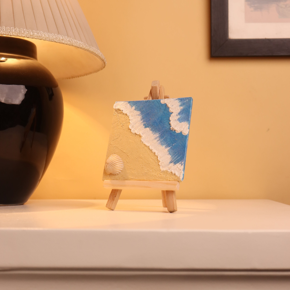 Immerse yourself in coastal calm with this beautifully handcrafted 4x4 inch canvas painting—an elegant blend of texture, simplicity, and oceanic charm. This miniature artwork captures a serene shoreline where textured white waves gently crash onto golden sands under a clear blue sky. Crafted using thick textured acrylic paint and an original sea shell, the painting offers a rich tactile experience and a striking visual contrast. The bold brush strokes and layered textures mimic the motion of the sea, while the natural shell embedded in the sand adds authenticity and a coastal touch. Displayed on a charming mini wooden easel, this compact beach-inspired canvas is perfect for desks, shelves, or gifting. Whether you’re decorating a coastal-themed room or seeking a thoughtful handmade keepsake, this piece brings the magic of the seaside to any space.