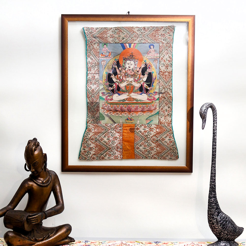 Buy a Namgyalma Deity Thangka painting online that is a breath-taking piece of art on cloth that seamlessly blends the spiritual essence of the Namgyalma deity with intricate floral and leaf designs in its border. This exquisite Thangka painting is a true masterpiece, worthy of being displayed in prestigious exhibitions and museums, where it will undoubtedly captivate art enthusiasts and connoisseurs alike. The Namgyalma deity is a revered figure in Tibetan Buddhism, known for her role in granting longevity, purifying negative karma, and protecting beings from untimely death. Her serene presence is beautifully portrayed in this Thangka, radiating compassion and wisdom to all who gaze upon it. The exquisite craftsmanship and attention to detail make it an ideal decoration for both spiritual spaces and contemporary settings. For collectors, this Namgyalma Deity Thangka is a must-have addition to their cherished collection. Its profound spiritual significance and artistic brilliance make it an invaluable acquisition, destined to become a prized possession. Beyond the realm of collectors, this Thangka serves as an incredible gift for family, friends, or relatives on special, festive, or auspicious occasions. As a thoughtful gesture, it bestows blessings of protection, longevity, and well-being upon the recipient, making it a treasured and unforgettable present.