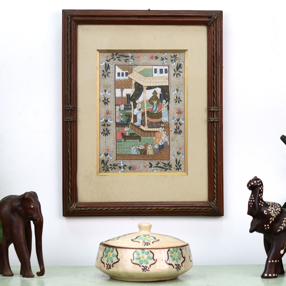 This captivating silk painting is a window into the rich cultural heritage of Rajasthan. Blending Persian aesthetics with the grandeur of the Mughal court, the artist has masterfully captured the region's timeless elegance. Vibrant hues of crimson, gold, and azure dance across the luxurious silk, framing regal figures and intricate floral patterns that seem to come alive on the canvas. Owning this painting is more than just adding a beautiful piece of art to your home - it's an opportunity to own a piece of history. Each stroke of the brush, each carefully placed pigment, tells a story of Rajasthan's artistic legacy. Display this treasure in your living room, study, or bedroom, and let it transport you to the opulent courts of the Mughal emperors. Elevate your space with the timeless beauty of this Rajasthani masterpiece.