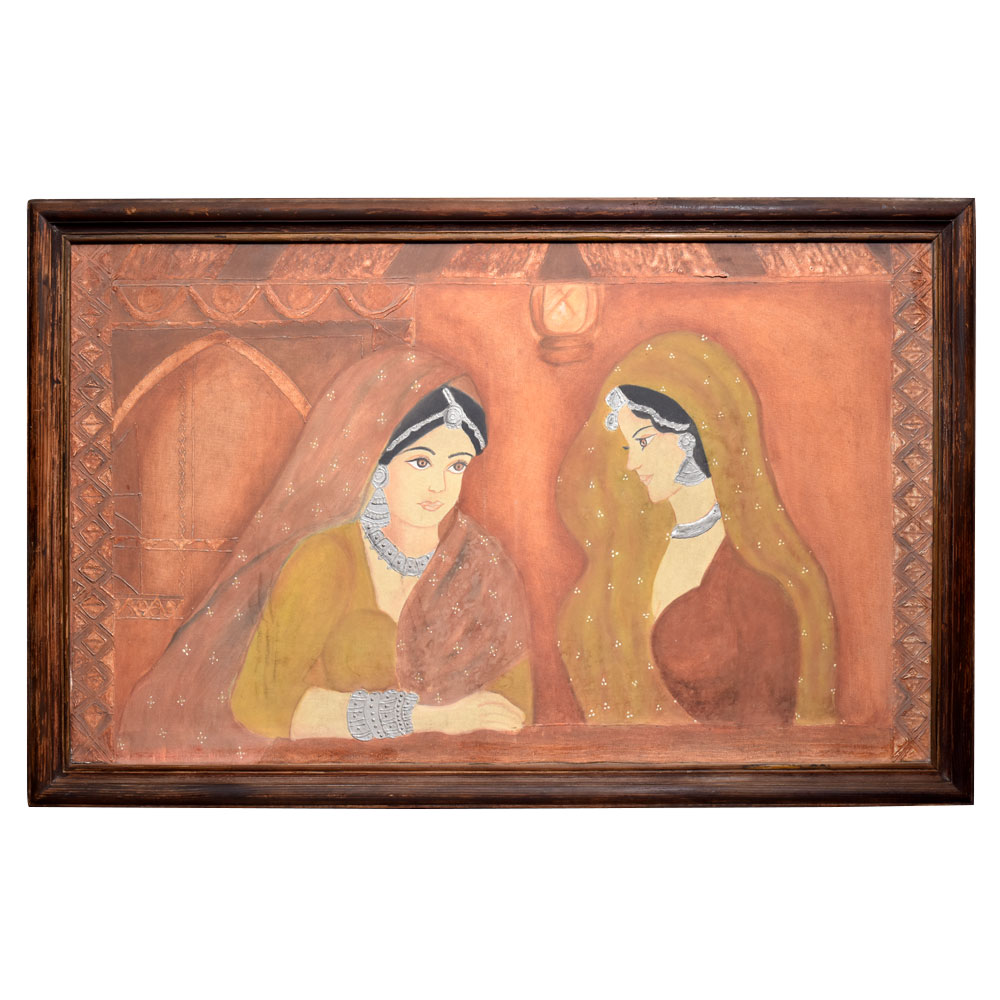 This stunning painting is more than just a decorative piece - it's a window into the rich heritage and traditions of Rajasthan. The two captivating female figures, rendered in the distinctive Rajasthan style, emanate a sense of grace, elegance, and timeless beauty. The vibrant hues and intricate patterns create a mesmerizing visual experience that will elevate any room. Whether you're a seasoned art collector or simply seeking to infuse your living space with a touch of cultural charm, this painting is the perfect addition. It will instantly become the focal point of any wall, drawing the eye and igniting conversations about the fascinating art of Rajasthan. Elevate your home decor and immerse yourself in the captivating world of Indian art with this stunning piece.