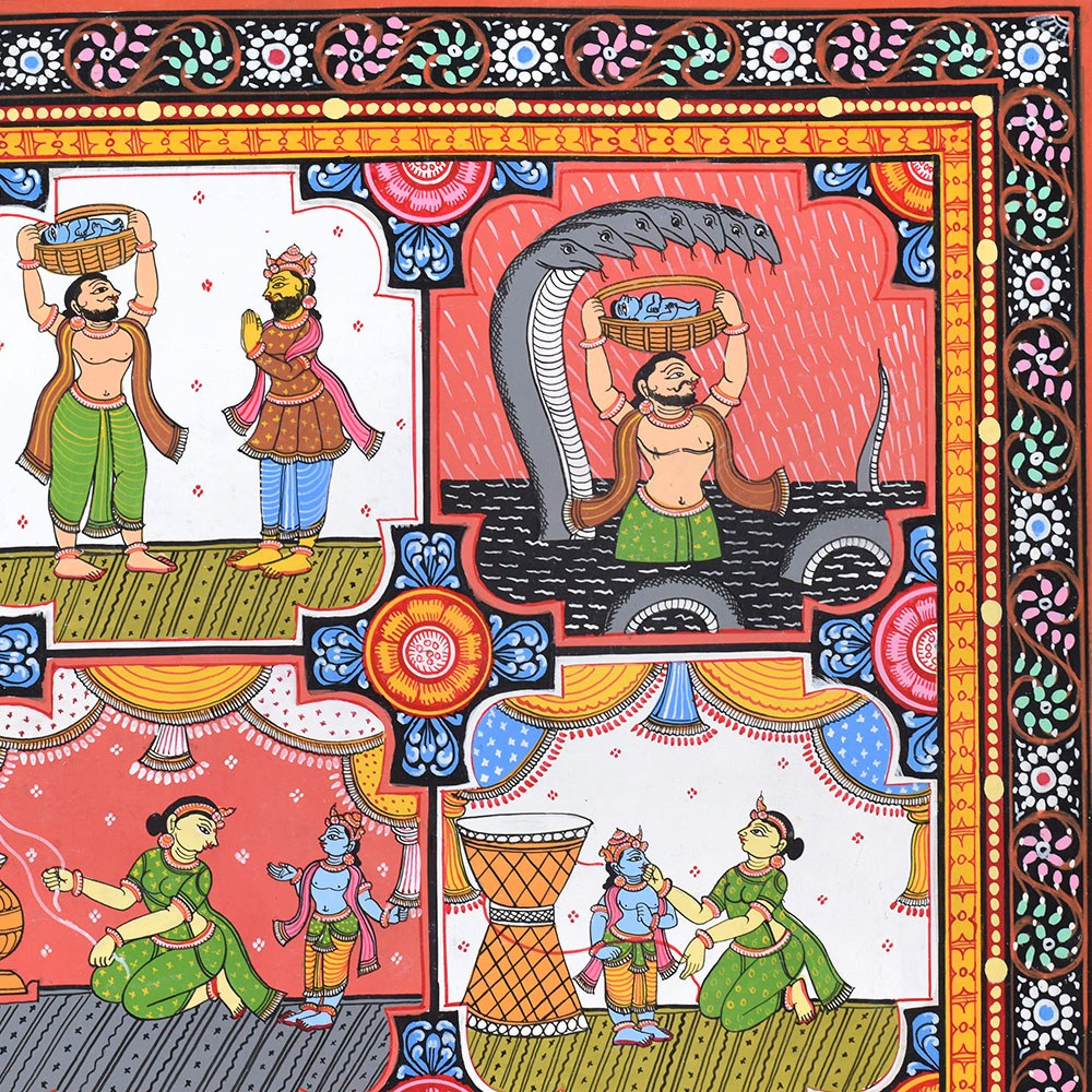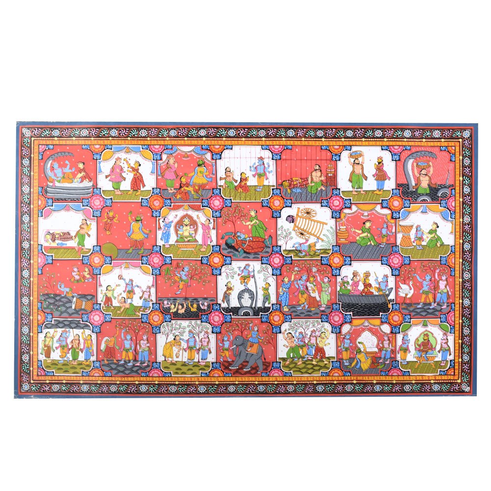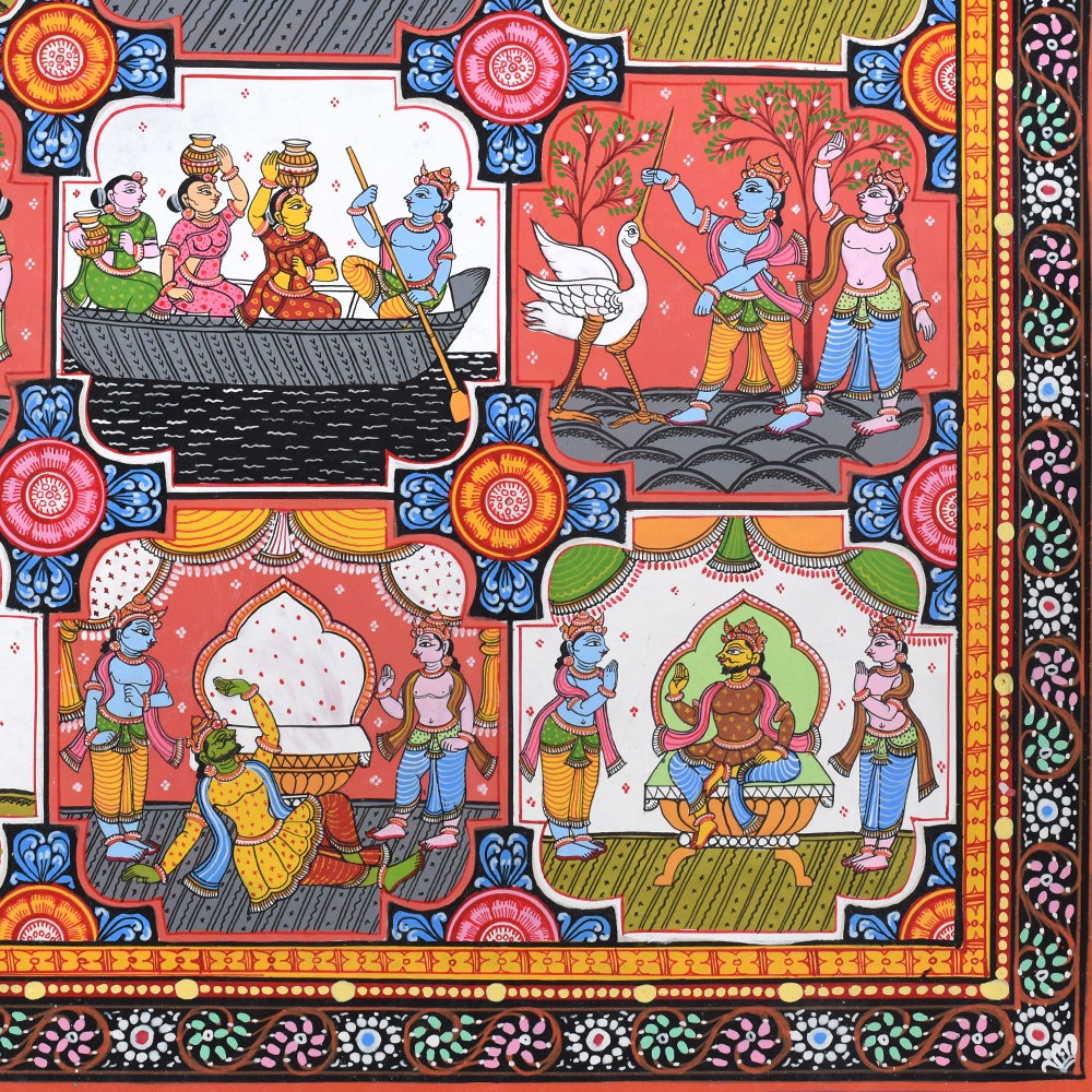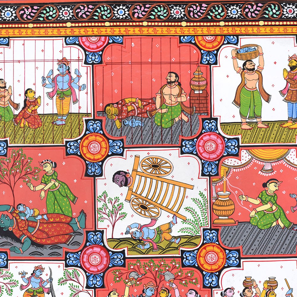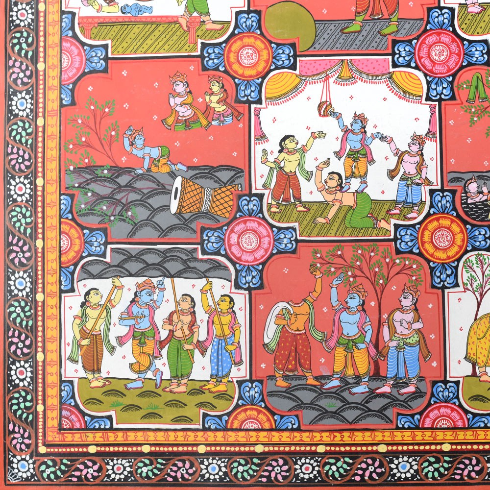 This Pattachitra painting vividly depicts various episodes from the life of Lord Krishna, illustrating his childhood and divine actions, presented in a series of colorful panels. Pattachitra, a traditional Indian art form originating from Odisha, is known for its intricate detailing, and this painting is no exception. The entire composition is framed with vibrant, rich colors, with Krishna's divine plays (Leela) showcased across multiple scenes. In the painting, Krishna's early life is highlighted in several panels, including his mischievous acts as a child. For instance, his playful stealing of butter from the homes of the gopis (milkmaids) is a recurring theme, emphasizing his love for simplicity and joy. The vivid colors used, such as the bright reds, yellows, and greens, enhance the energetic nature of Krishna's leelas. These colors symbolize purity, life, and the divine essence of Krishna's character. This event signifies Krishna's divine intervention to save his devotees from disaster. The artist uses bold lines and dramatic contrasts to portray the massive hill being held aloft, while the villagers take refuge under it, symbolizing Krishna's role as a protector and savior. Further panels capture other aspects of Krishna's life, such as his interactions with animals, particularly the cows, and his flute-playing. These elements represent Krishna’s deep connection to nature and his nurturing spirit. The presence of peacocks, cows, and trees in the artwork creates a sense of harmony with the environment, which is a significant theme in Krishna's teachings. The lower panels depict Krishna's relationships with his devotees, particularly his bond with Radha. Their love is a central motif in many of Krishna's stories, representing divine love and devotion. The gopis' adoration and Krishna's transcendental love for them are reflected in the painting's narrative and artistic style. The intricate details and the vivid storytelling make this Pattachitra painting a timeless and beautiful representation of Lord Krishna's life, highlighting his divine qualities of love, mischief, wisdom, and protection. Each panel serves as a reminder of Krishna's teachings, offering spiritual insight and aesthetic pleasure through traditional art.