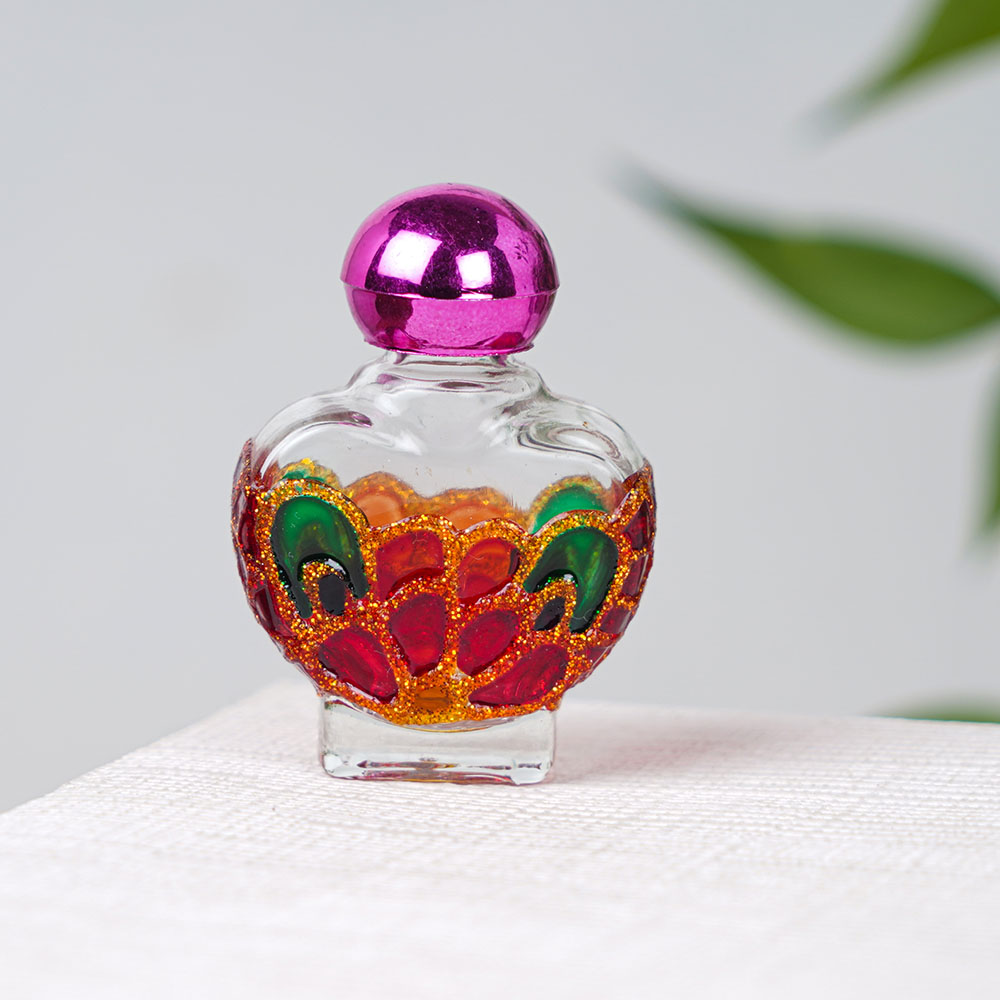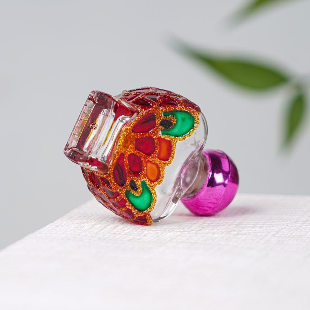 Buy a perfume glass bottle online that is a true masterpiece crafted by highly skilled Indian craftsmen. The bottle features a stunning blend of red and green colours with golden sparkles carved into its glass. The intricate design adds a touch of elegance to the bottle, making it a perfect addition to any collection. The bottle has a unique pink colour knob, which is used to close the bottle, adding a pop of colour to its overall appearance. This versatile bottle can be used for perfumes or oils and is perfect for those who love to collect perfume tester bottles or mini perfume bottles. The bottle can be placed on a table or shelf for decoration, and its beautiful design is sure to catch the eye of anyone who sees it. It's a lovely gift option for your family, friends, or relatives, especially for special or festive occasions. This handmade glass bottle is not just a container for your favourite fragrance, but a work of art that speaks to the passion and creativity of the craftsmen who made it. The bottle is an excellent choice for anyone looking for empty perfume bottles or mini perfume bottles that are both functional and beautiful.