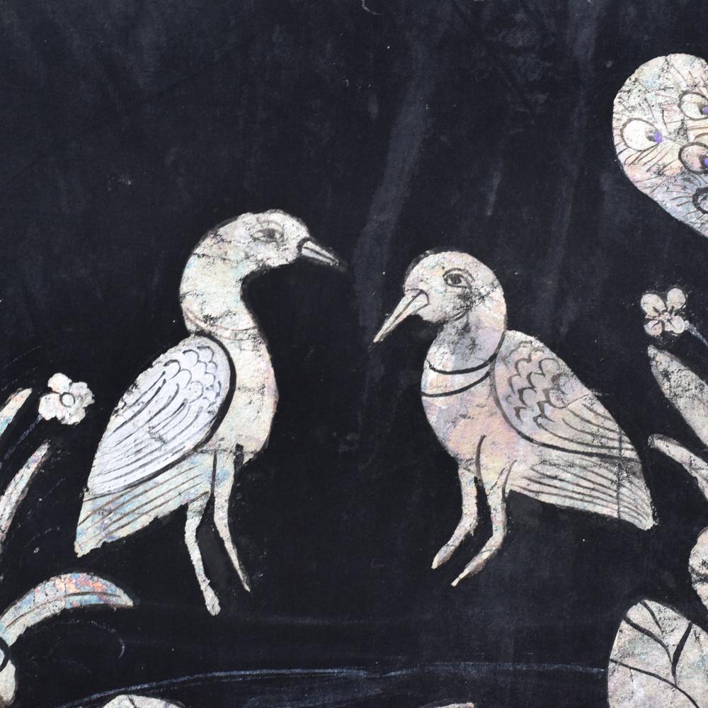 - Exquisite lotus, peacock, and bird engravings in the lower half