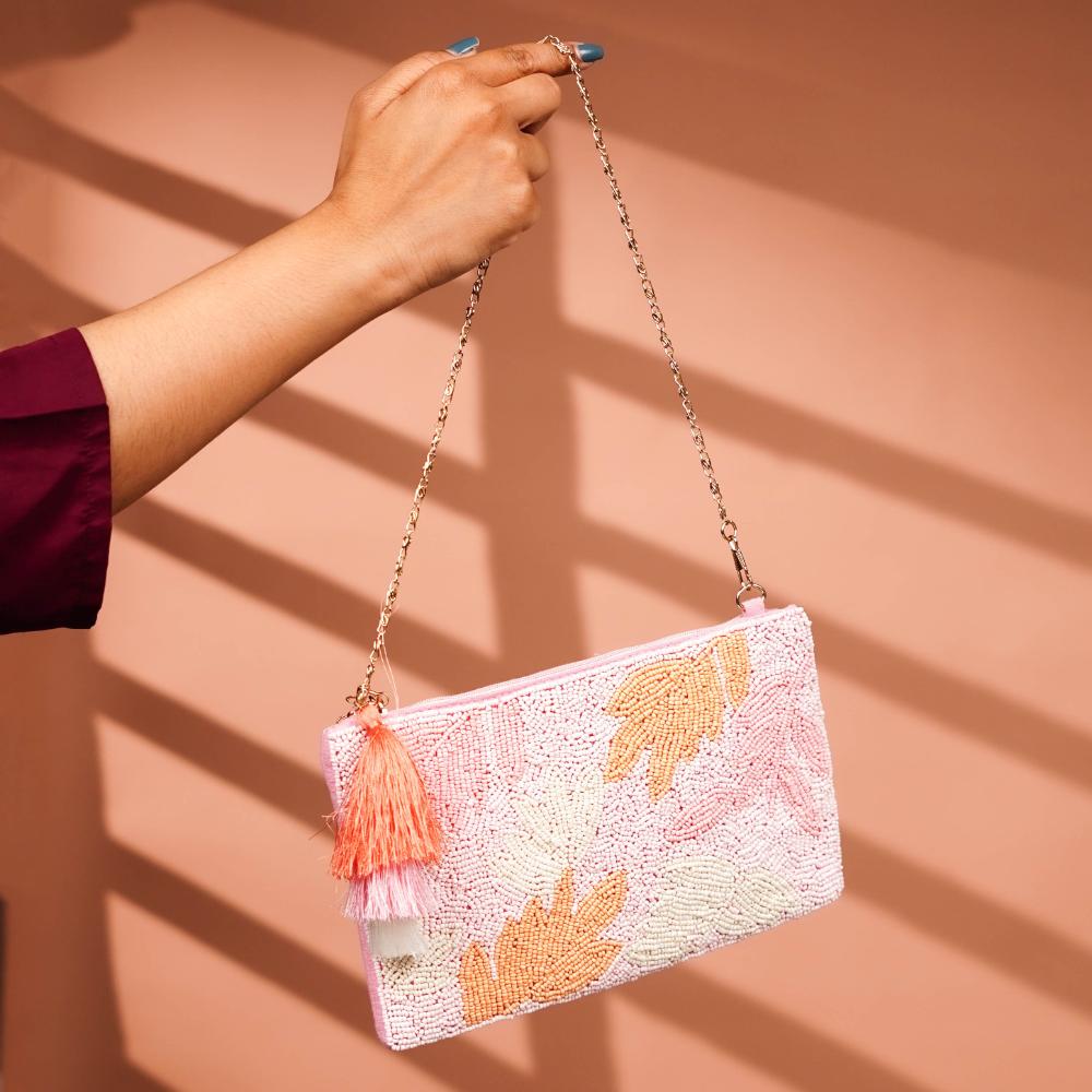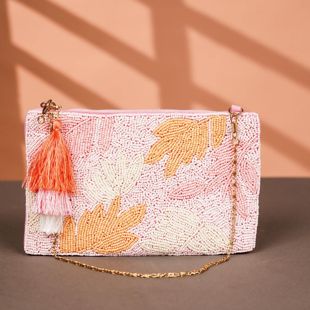Delicate and refined, this cotton and beads handbag is a gentle nod to spring’s blooming beauty. Crafted with a pale pink cotton base, the bag is adorned with soft orange and peach hand-beaded leaf motifs, creating a serene, nature-inspired design. A coordinating tassel in blush, coral, and white adds whimsy, while the fine gold chain brings a touch of elegance. Lightweight yet impactful, this bag is perfect for daytime outings, garden parties, and springtime celebrations.