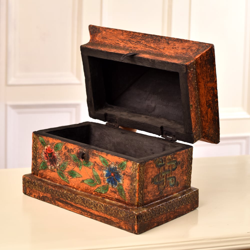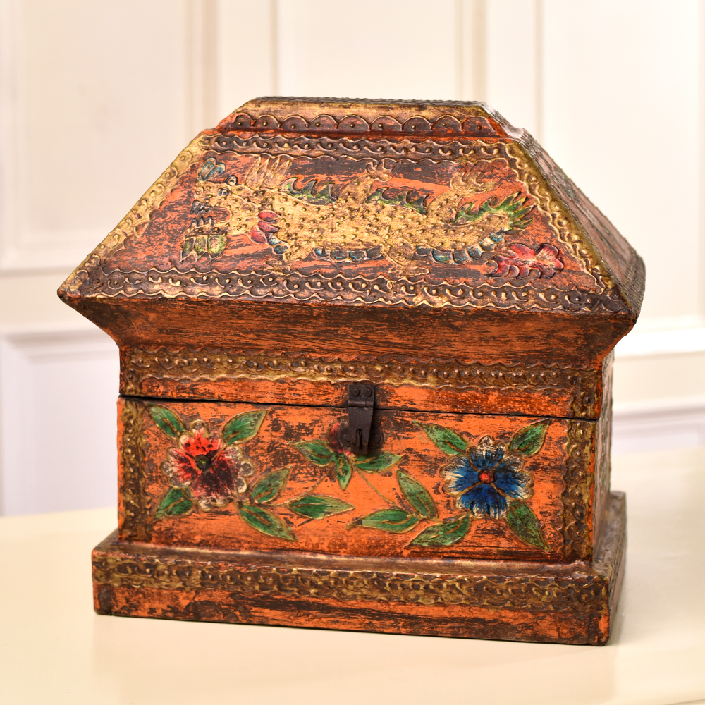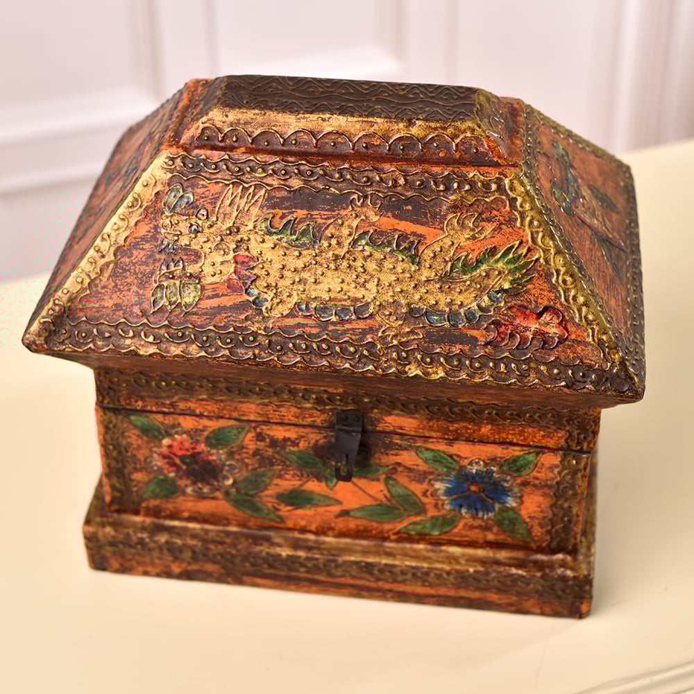 A Wooden Dragon and Floral Engraved Box which is a true masterpiece of craftsmanship created by skilled Indian artisans. This multi-coloured treasure chest is a testament to the artistry and dedication of these talented craftsmen, who have poured their heart and soul into every intricate detail. Crafted from high-quality wood, this handmade box showcases a stunning dragon and floral motif, painstakingly engraved on its surface. The intricate designs are a testament to the rich cultural heritage of India, and they add a touch of elegance and mystique to any space. With a secure latch, this box serves as a perfect repository for your cherished jewelry, keepsakes, or other small items. Its versatility knows no bounds, making it a stylish and functional addition to your home decor. You can even proudly display it at exhibitions to share its beauty with the world. This box is not just an accessory but also a meaningful gift. Share the beauty and artistry of Indian craftsmanship with your loved ones on special occasions or festive celebrations. Each box is a unique piece of art, a blend of tradition and contemporary utility, making it a remarkable and thoughtful present.