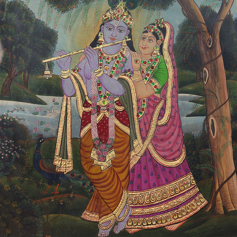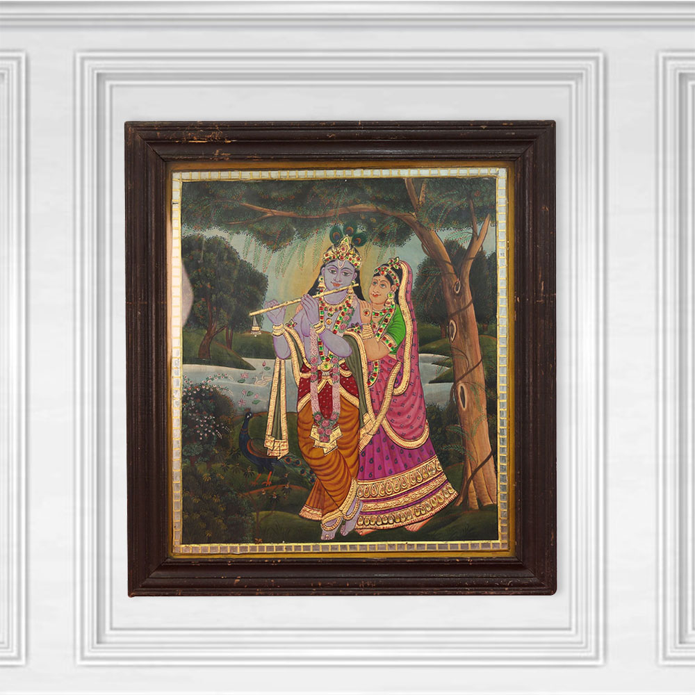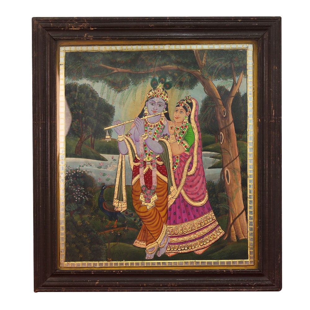 Prepare to be mesmerized by the stunning Tanjore painting of Radha Krishna, encased in a beautiful frame. This exquisite work of art is a true masterpiece, showcasing the unparalleled skill and artistry of India's most talented painters. This captivating Tanjore painting transports you to the enchanting world of Hindu mythology, where the divine love story of Radha and Krishna unfolds. Radha, the beloved cowherd, gazes adoringly at her beloved Krishna, the charming avatar of the god Vishnu. The painting's rich hues and intricate embellishments create a mesmerizing visual experience that will captivate your senses and ignite your imagination. Whether you're a collector of fine art, a devotee of Hindu culture, or simply someone who appreciates the beauty of timeless craftsmanship, this Tanjore painting is a must-have addition to your home or office. Imagine the joy of displaying this stunning artwork, which will not only elevate the ambiance of your space but also serve as a conversation piece that showcases your impeccable taste and appreciation for the arts. Elevate your surroundings and immerse yourself in the divine love story of Radha and Krishna with this exquisite Tanjore painting.