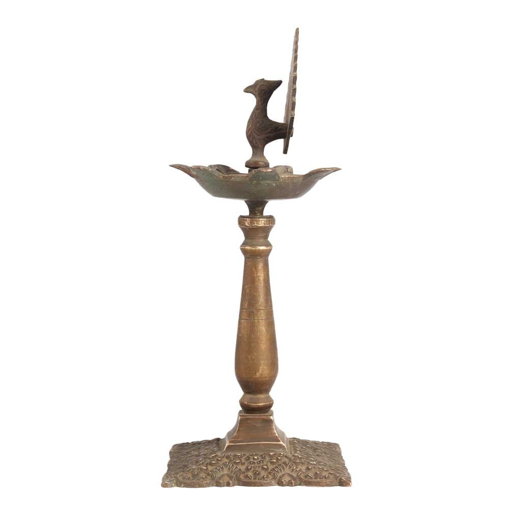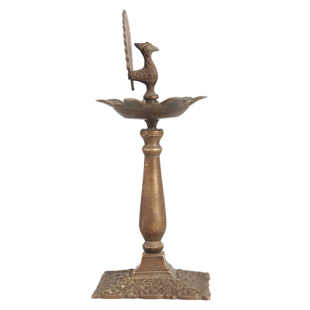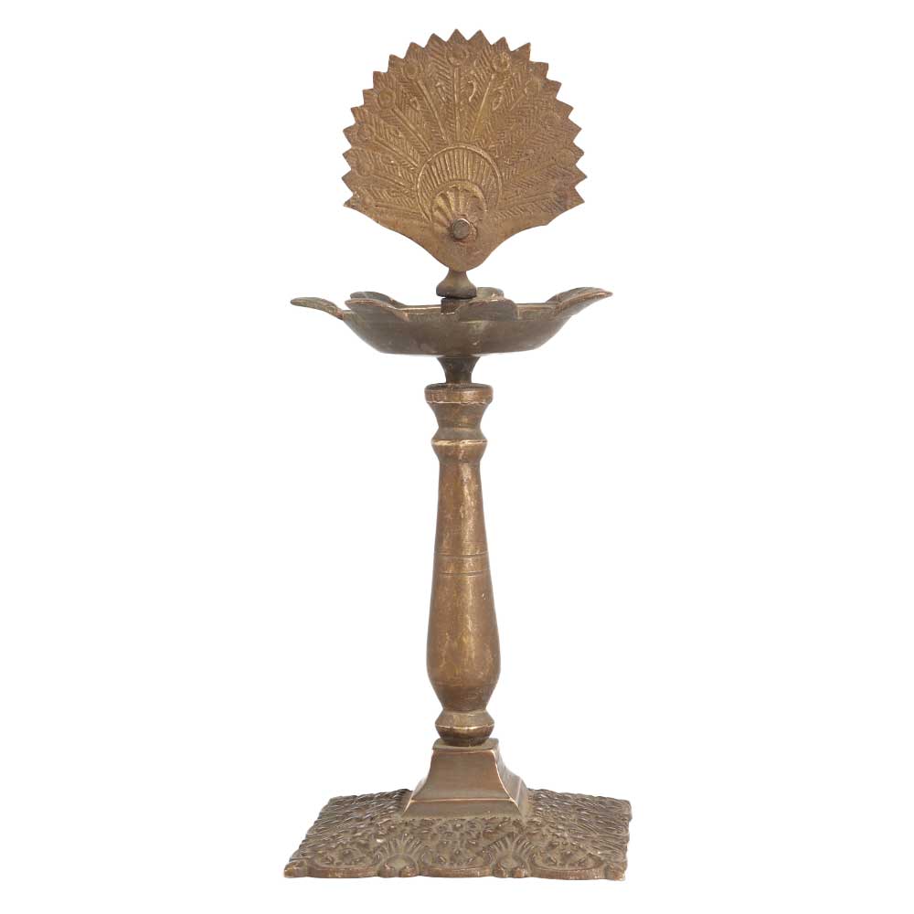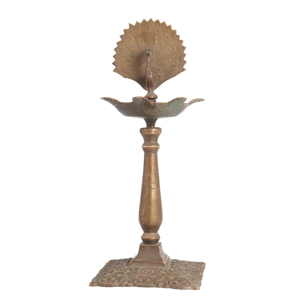 A used brass oil lamp made by skilled artisans from India to make a remarkable impression in interior design. This brass oil lamp is carved in a peacock on top and has a unique shape with 7 jyots. Light 7 jyots at once on special occasions with mustard oil or ghee to spread light and catch the eyes of your visitors and guests. An oil lamp for stage, wedding and party decorations to add an alluring flair to interiors. For centuries, this brass oil lamp has been used in India during power outages, for decoration and special occasions. Place this incredible piece of art in your living room or hallway or gift it to your family, friends or relatives on special and festive occasions.