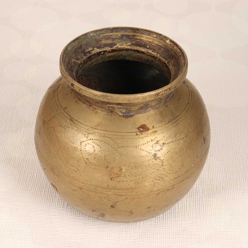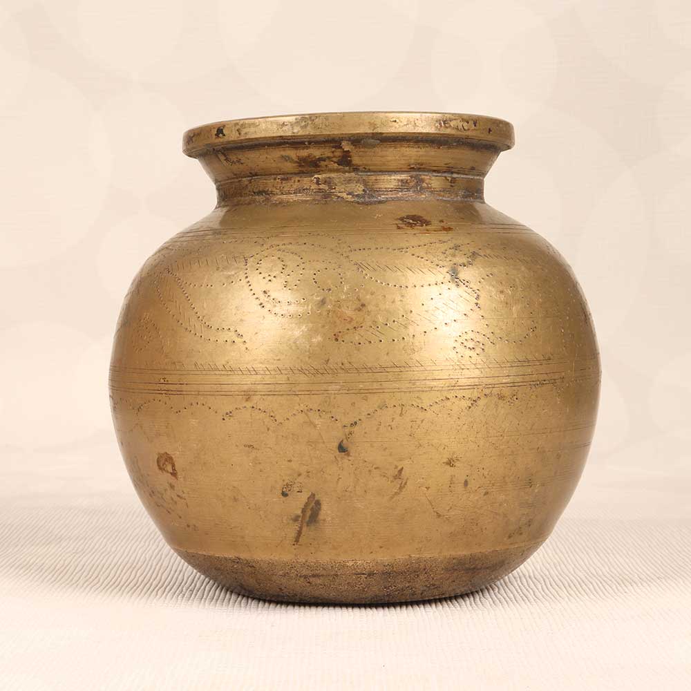 Bring grace and elegance to your home with this stunning vintage brass holy water pot. This intricately engraved pot evokes the rich artistic heritage of South India, making it the perfect statement piece for your home decor. This brass pot adds a touch of spiritual flair wherever it's displayed. Place fragrant flowers in it to perfume your home with their scent. Use it to hold holy water for rituals and prayers to focus your intentions. The elegant shape shows off floral arrangements beautifully. With its antique styling, this pot is sure to draw compliments! If you appreciate cultural artifacts and want a unique focal point for your home, this vintage holy water pot is for you. The detailed engraving and graceful shape give it an air of history and meaning that manufactured pieces lack. Let this brass pot infuse your home with beauty, meaning, and sacred energy.