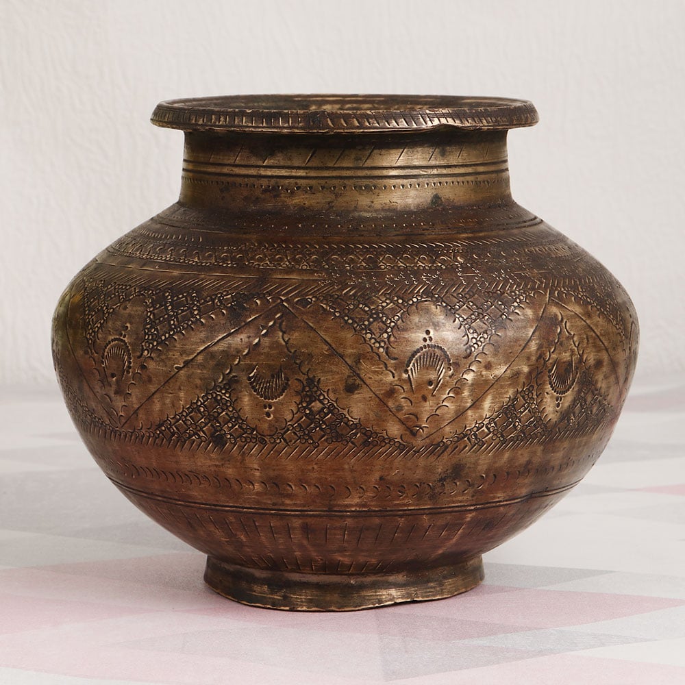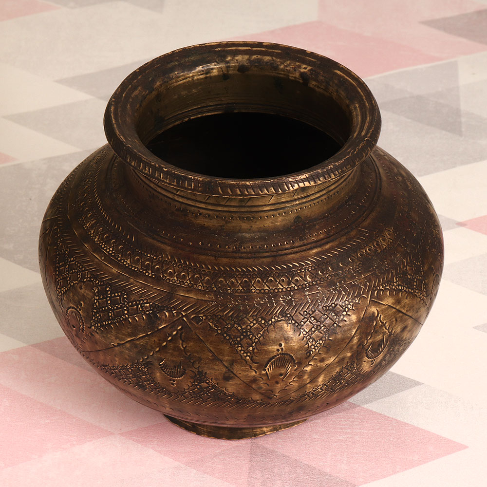 A Vintage Brass Holy Water Pot which is a testament to the craftsmanship of highly talented Indian artisans. Imbued with South Indian artistry, this piece is a fusion of beauty, tradition, and functionality. Crafted from high-quality brass, the pot boasts a stunning antique brown finish, adding an air of timeless elegance to any setting. Its intricate engravings tell a story of devotion and artistry, making it a work of art in its own right. This versatile piece can adorn your home, office, restaurant, hotel, cafe, or shop, gracing any space with its regal presence. As a flower pot, it brings the charm of vintage aesthetics indoors, housing your favourite blooms or succulents. Furthermore, it fulfills a sacred purpose by being a vessel for holy water during havans, rituals, and auspicious ceremonies. As a unique addition to your vintage collection or a thoughtful gift for loved ones during special, festive, or auspicious occasions, this Vintage Brass Holy Water Pot is a treasure that encapsulates the essence of Indian craftsmanship and spirituality.