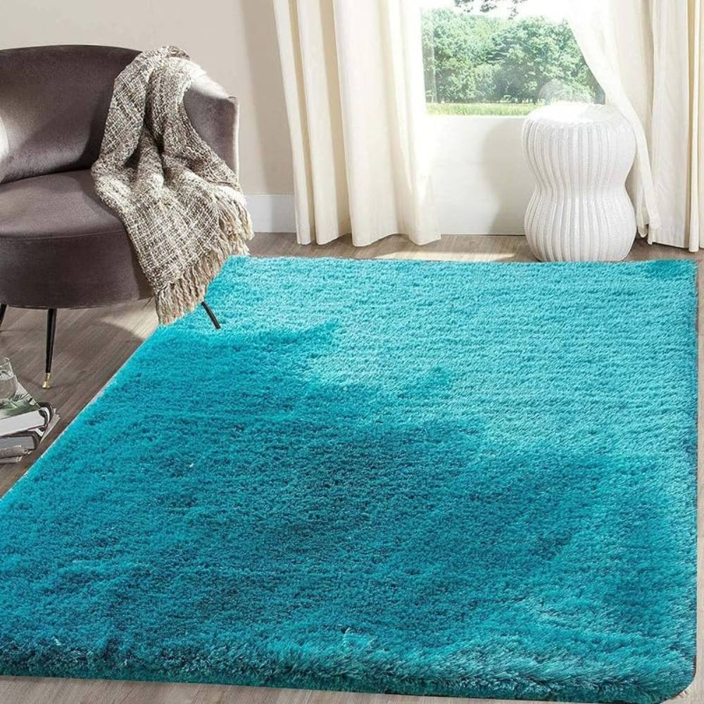 Vacuum gently with a soft brush attachment to maintain the plush texture. Blot spills immediately using mild detergent and water. Avoid soaking or direct sunlight to preserve its vibrant turquoise color and softness.