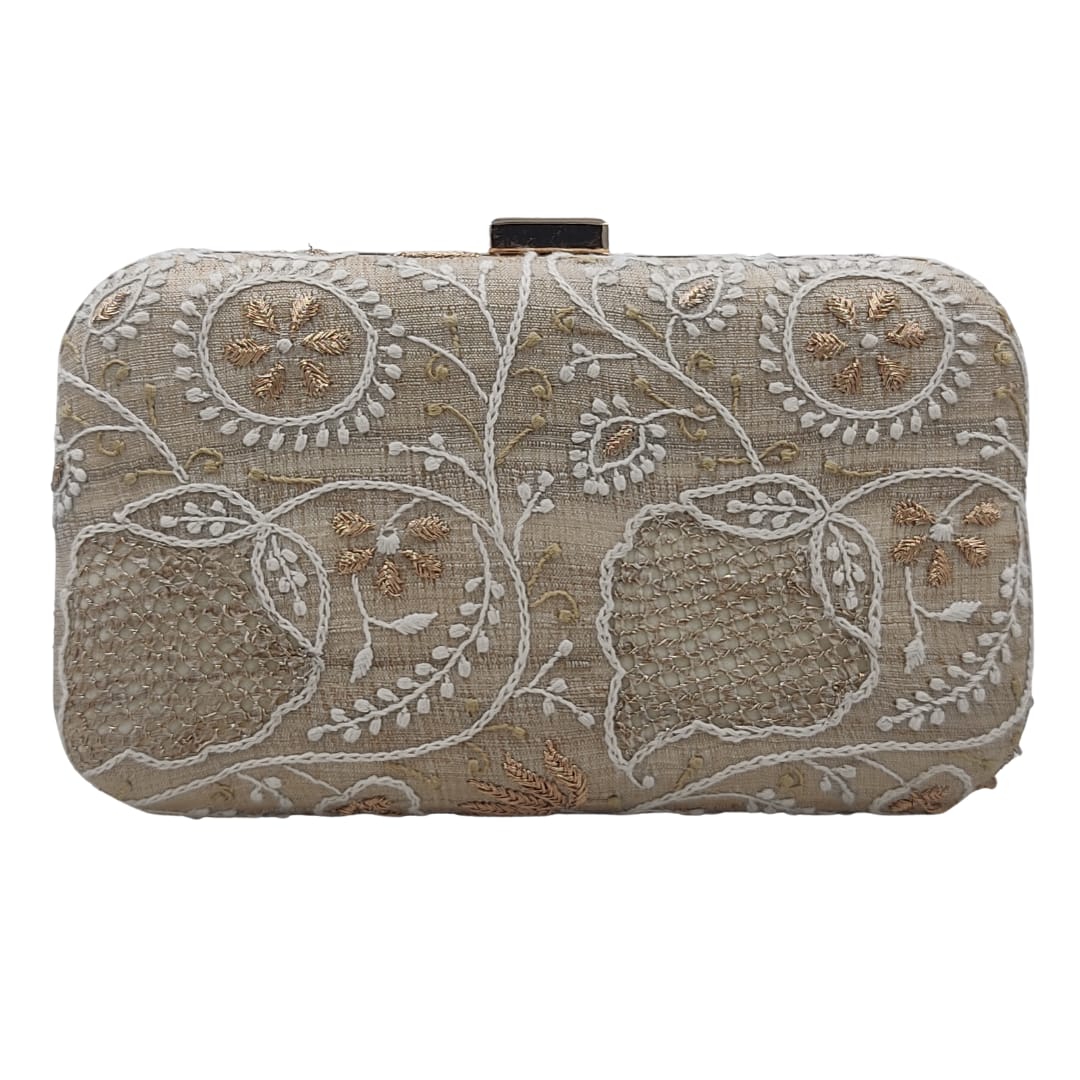 Elevate your accessory game with this elegant handcrafted clutch, made from luxurious tussar silk in a subtle beige-gold tone. Featuring delicate Chikankari embroidery across the surface, the design is beautifully enhanced with intricate kasab (metallic thread) highlights, lending it a refined and timeless appeal. The clutch showcases elegant floral and vine motifs that blend tradition with modern elegance, making it an ideal companion for festive occasions and celebrations. This clutch comes with a sleek metal chain strap, allowing it to be carried hands-free or as a statement handheld piece. Compact and lightweight, it’s perfectly sized to hold your essentials like a phone, cards, and makeup touch-ups. Whether you're dressing in a saree, salwar suit, or Indo-western outfit, this versatile clutch adds the perfect finishing touch to your ensemble. A must-have for anyone who appreciates fine craftsmanship and understated luxury in ethnic fashion.