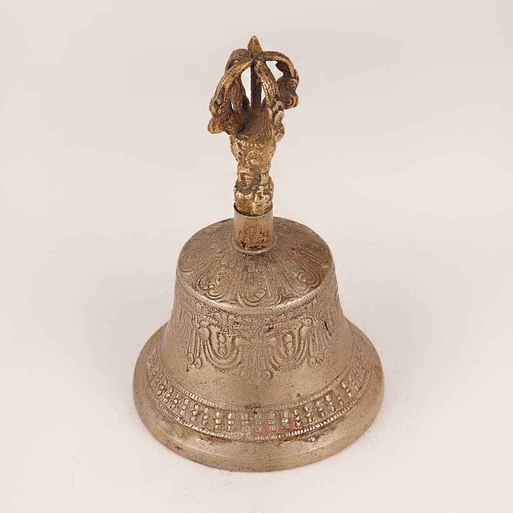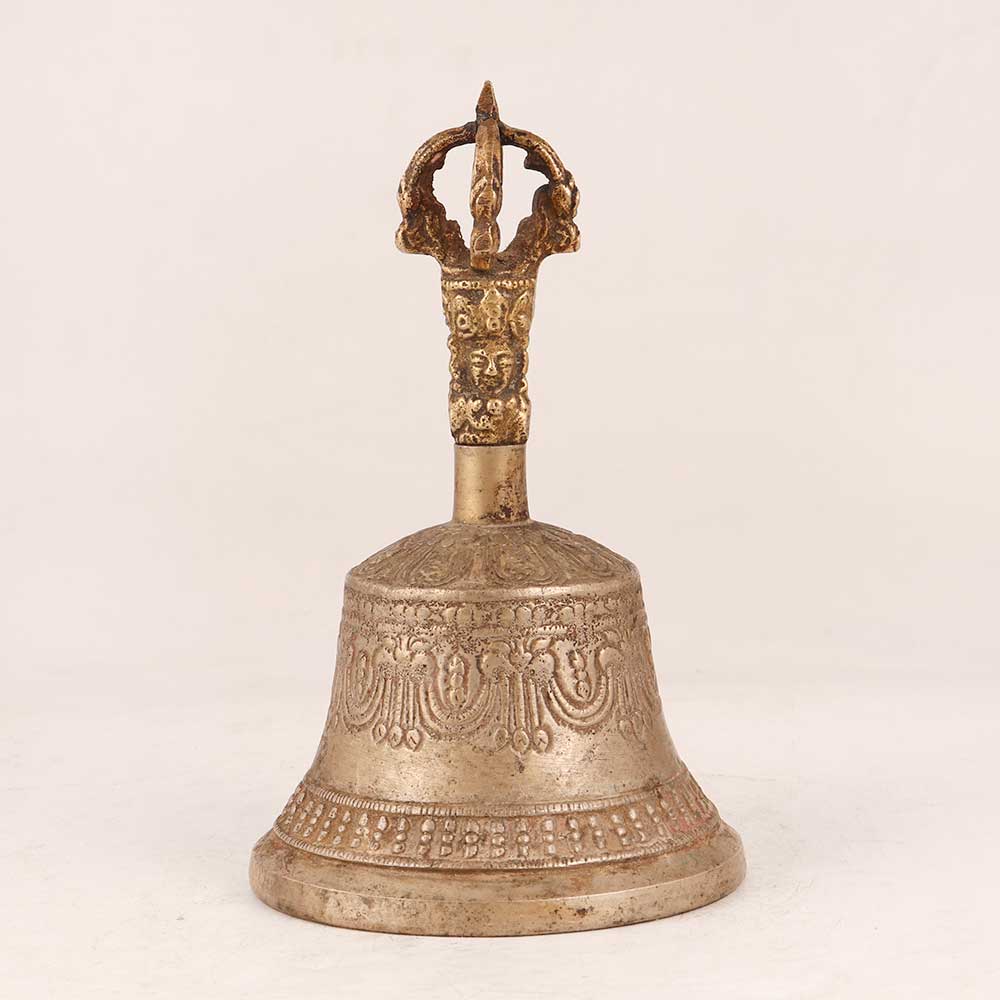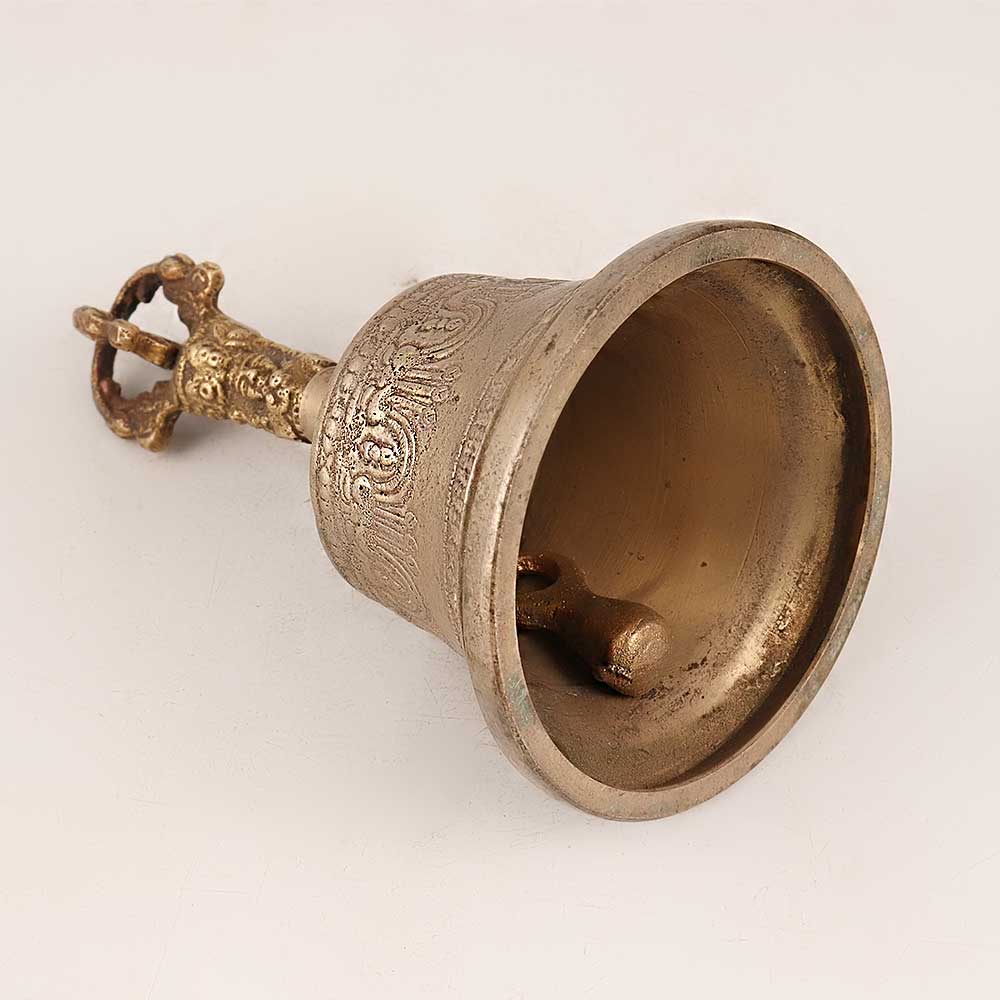 Experience the serenity of Buddhist art with our exquisite Bell Metal Temple Bell. This masterpiece boasts intricate engravings that encapsulate the essence of Buddhist spirituality. The handle features a meticulously crafted deity, adding a touch of divinity to its already captivating design. Meticulously handcrafted by skilled artisans, this bell is made from high-quality bell metal, ensuring its durability and resonance. Its antique brown finish exudes an old-world charm, making it a timeless addition to any space. Perfectly versatile, this bell fits seamlessly into various settings – be it your home, office, restaurant, hotel, or cafe's prayer room. Its soothing chime makes it ideal for morning and evening prayers, bringing a sense of tranquillity to your surroundings. Beyond its spiritual significance, this bell doubles as a captivating display piece, suitable for exhibitions or vintage collections. It's a thoughtful gift option for your loved ones on special, festive, or auspicious occasions, carrying not just the physical beauty, but also a sense of spiritual connection and positive energy.