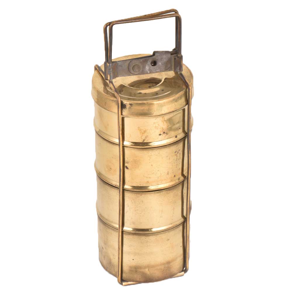 • Big Brass Tiffin Box With Four Containers And A Brass Strap Frame