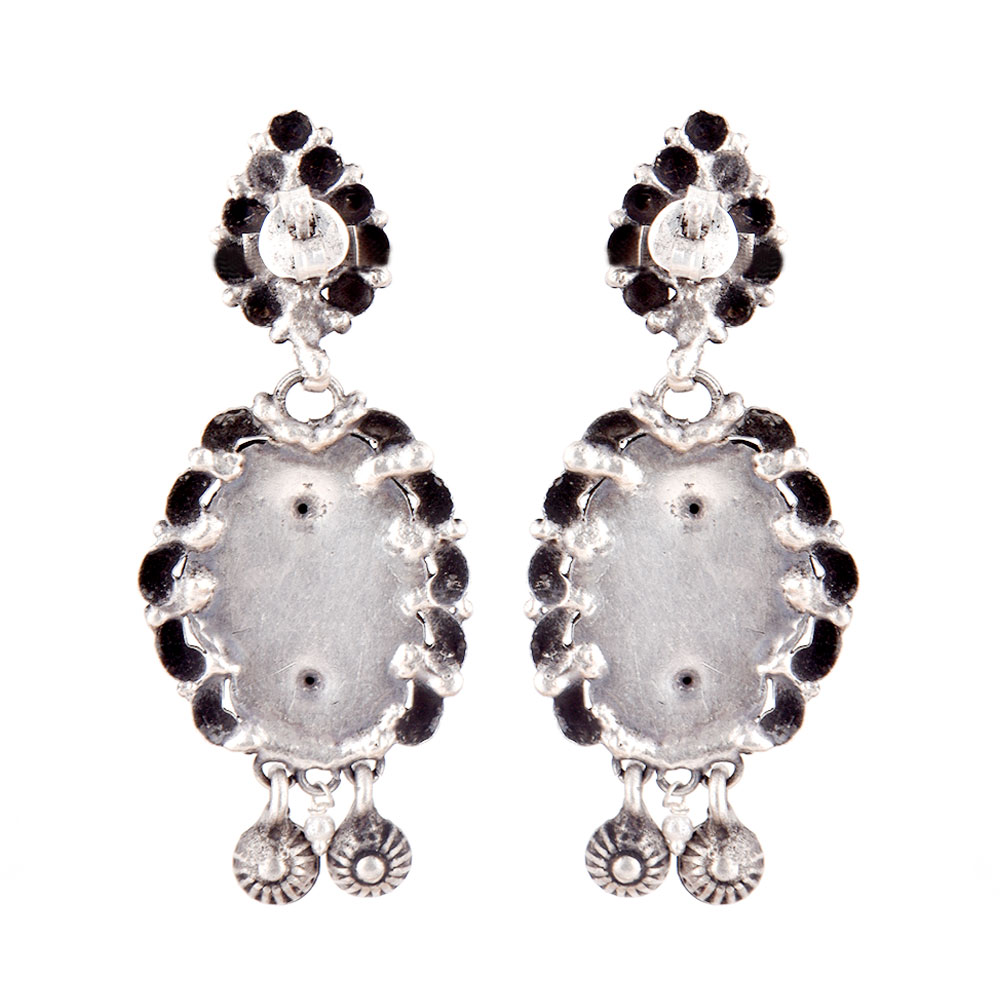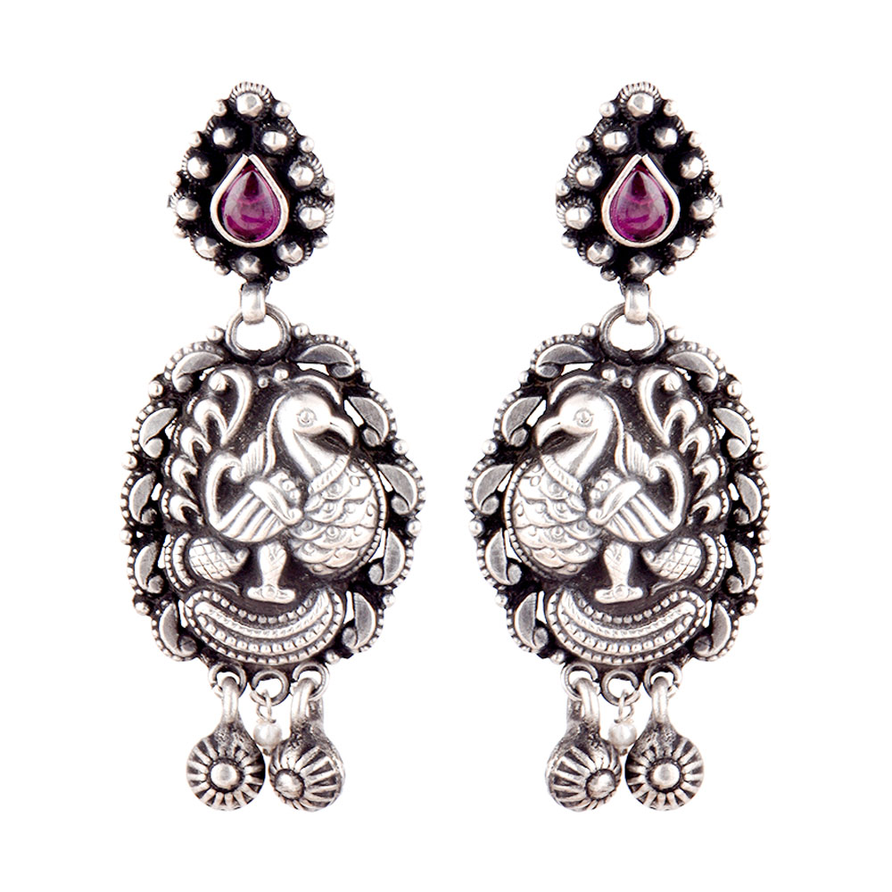 A very Traditional 92.5 Sterling silver Earrings with big peacock engraved on the danglers hanging motifs and big pear shaped Amethyst stone. Classic evening wear, party wear, birthday gift or as a souvenir for your new or dear ones.