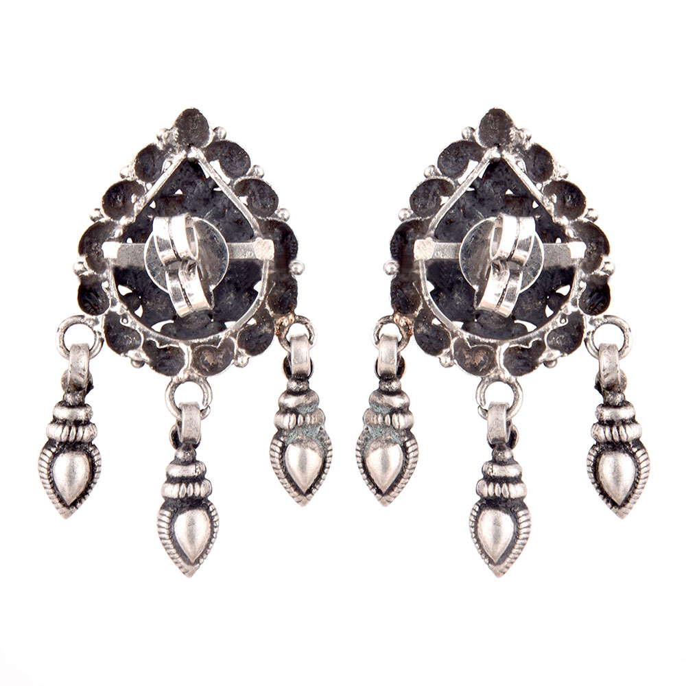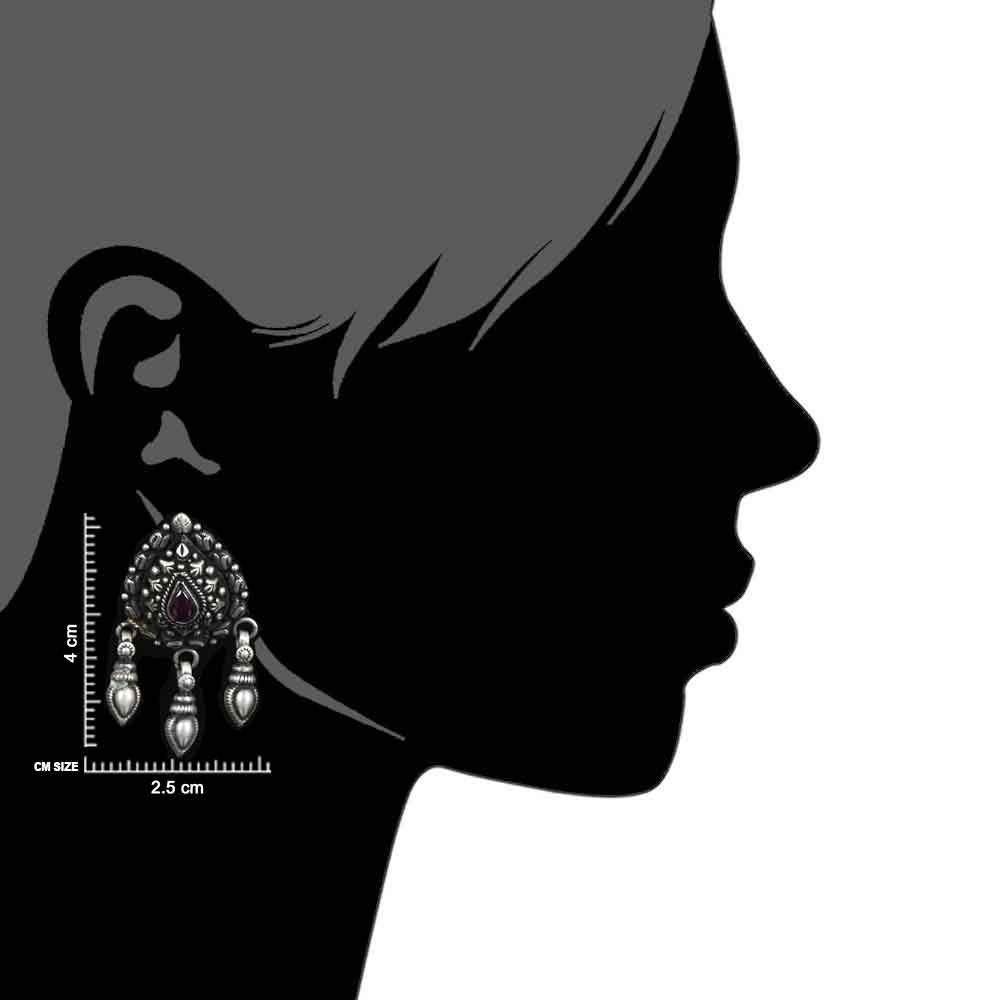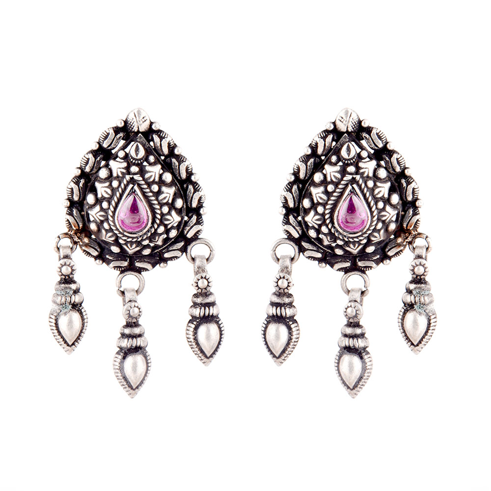Big Pear Shaped 92.5 Sterling Silver Earrings with embossed design and three silver beads tassel and big Amethyst stone in the centre. Wear it for a formal function, office gathering, picnic , graduation ceremony , inauguration ceremony or birthday party.
