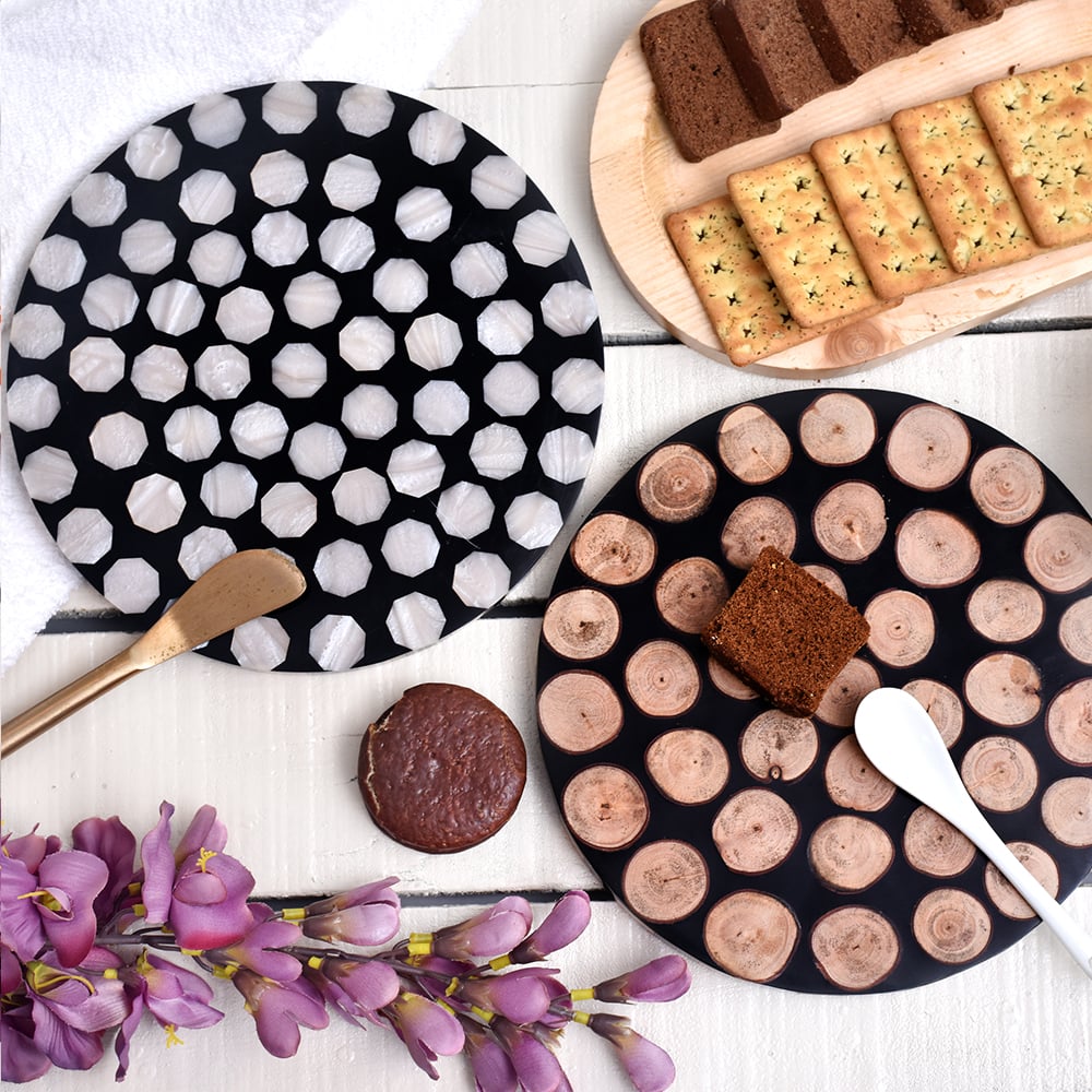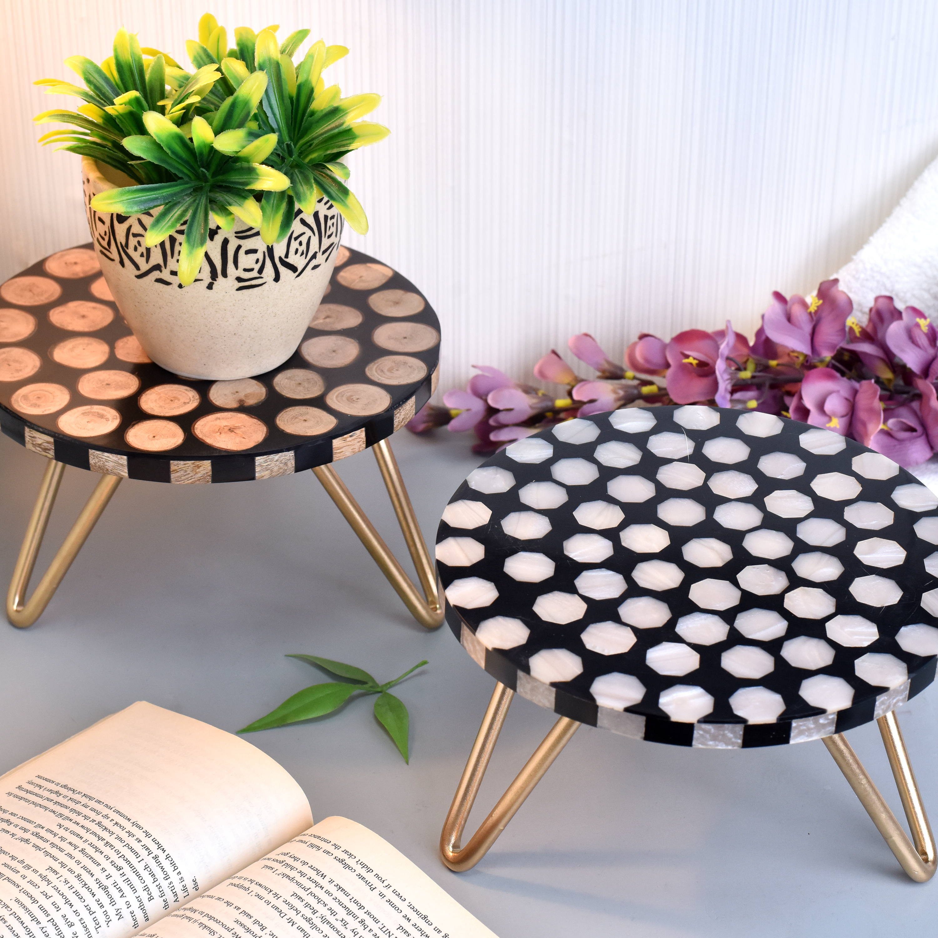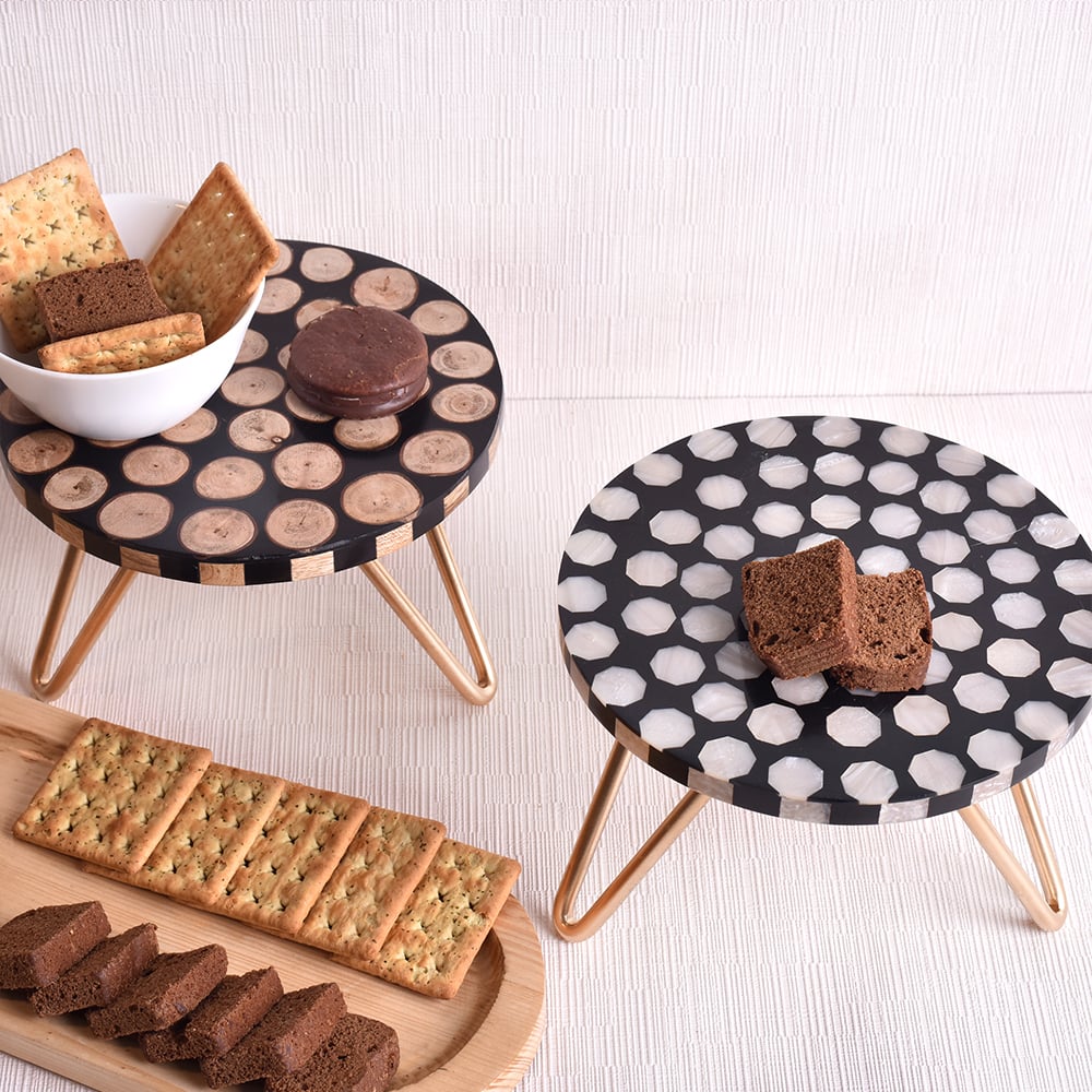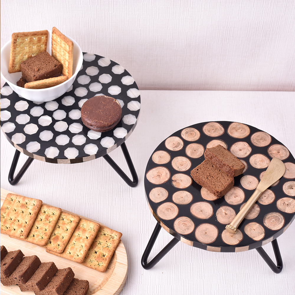 On these wood and resin cake stands, set an inviting scene for your baked goods and savoury snacks, and watch your guests swoon over your serving style. It has lovely discs embedded in the table top and is supported by iron legs. These cake stands are made from food-safe materials and other environmentally friendly materials, making them ideal for environmentally conscious homeowners. The multipurpose stands can be used to decorate (plants, accents, vases, sculptures) as well as serve (cakes, muffins, cookies, fruits, sandwiches).
