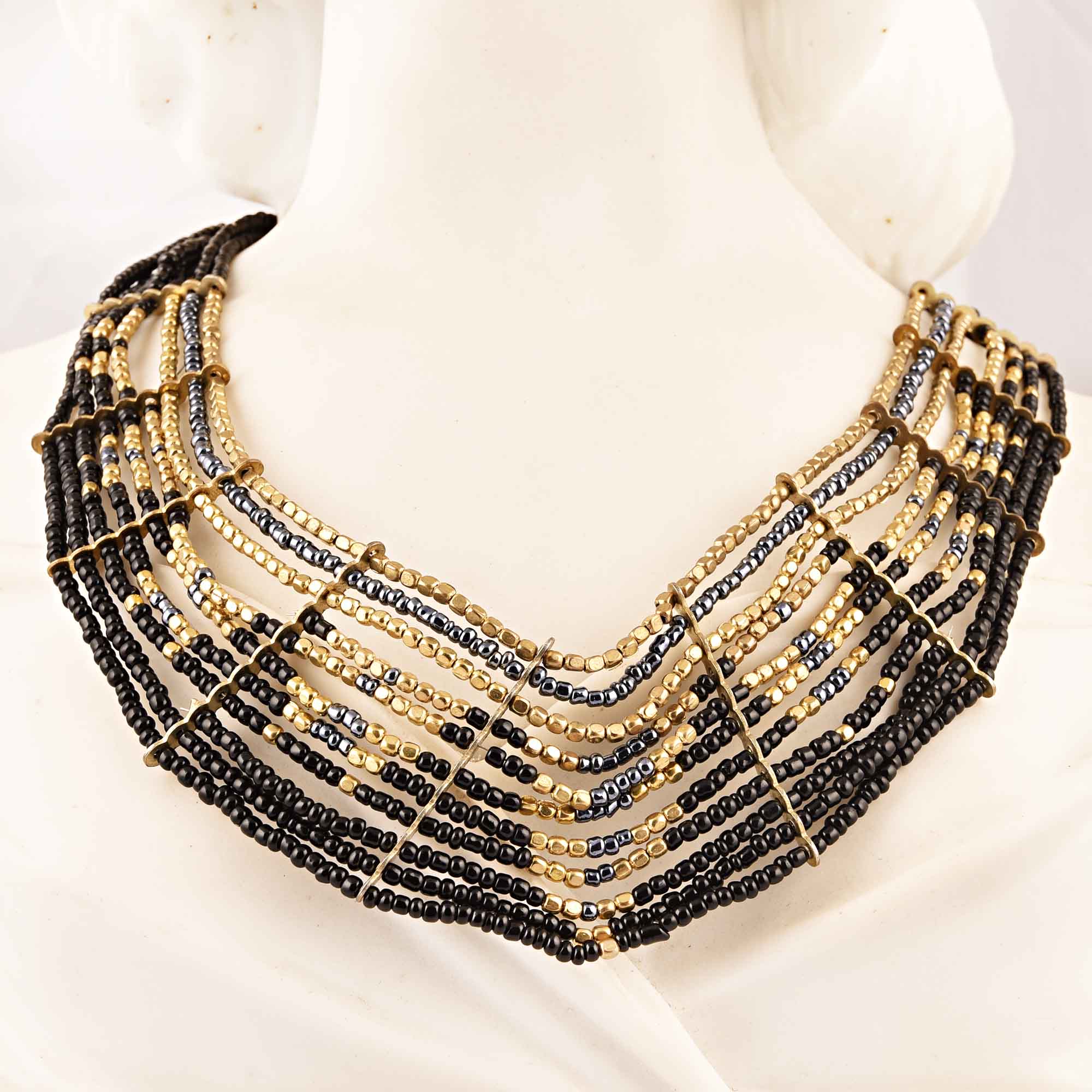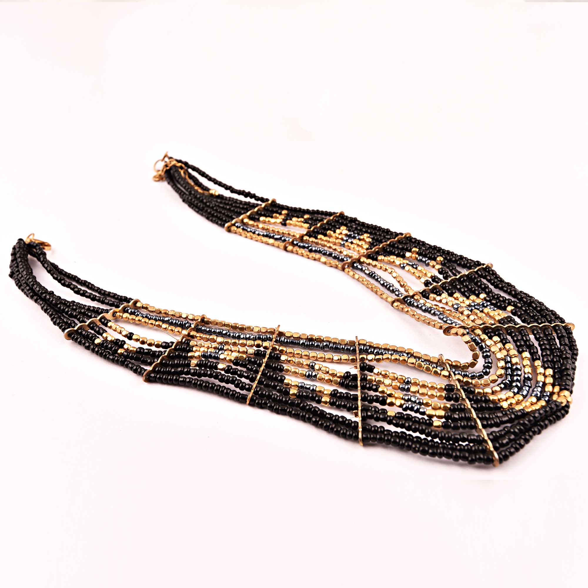 Black and Gold Necklace New Beautiful Jewellery. Seed Beads, Cotton With Rose Gold Plated Tie Back.