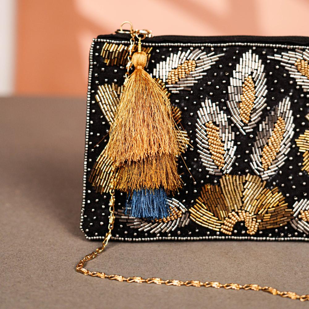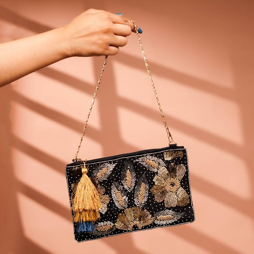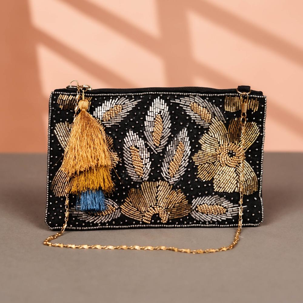 Draped in midnight black cotton and adorned with golden floral beadwork, this handbag exudes regal charm. Each flower is intricately embroidered with metallic beads in shades of gold, bronze, and silver, forming a radiant contrast against the dark base. The highlight of this design is a layered tassel in mustard gold, bronze, and a hint of blue, adding character and flair. Paired with a delicate gold chain, this elegant handbag transitions effortlessly from formal dinners to festive celebrations.