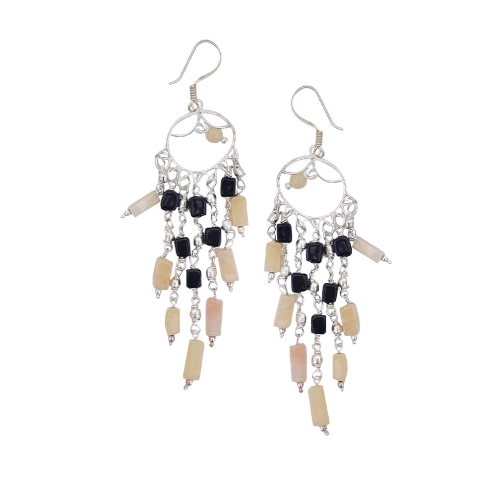 Black and peach beaded dangle drop earrings are a type of earring that features black and peach colored beads hanging from a 92.5 sterling silver dangle-style setting. The beads are often strung together to create a chain or a cluster of beads that dangle from the earlobe. The black and peach color combination can create a unique and stylish contrast. These earrings are often worn as a fashion statement and can be paired with casual or formal attire. The materials used to make the beads could be glass, plastic, stone, metal or natural materials like wood or seeds. These earrings can be simple or elaborate in design, depending on the preference of the wearer.
