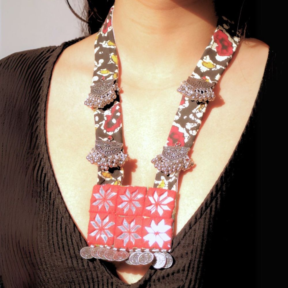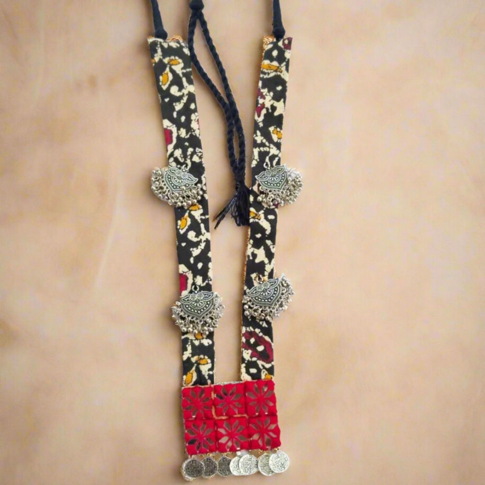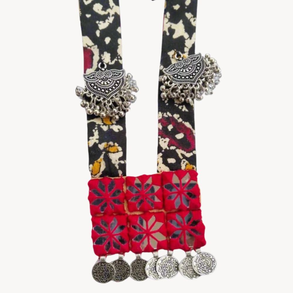 The Black and Red Mirror Long Necklace is a striking expression of handcrafted Indian adornment, where vivid color meets reflective artistry. Set on a fabric base, deep black and rich red tones create a powerful canvas for silver-toned mirror details that catch light with every movement. Inspired by folk aesthetics and festive traditions, this long necklace balances drama with wearability. Designed to stand out, it elevates simple outfits into confident, culture-rich statements.