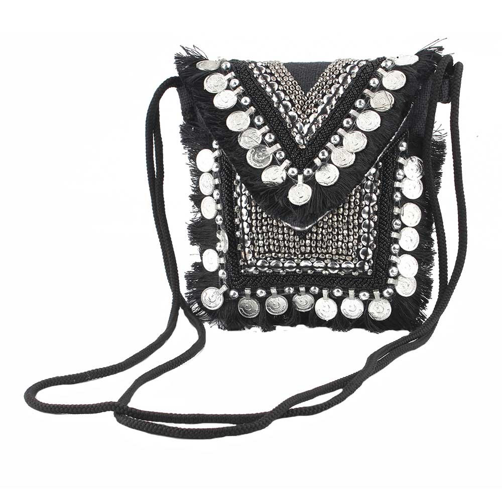 This Indian boho bag is produced ethically with love and features coin details and intricate bead work. It's the perfect festival purse or bridal clutch. Bring a little bit of boho wherever you go.