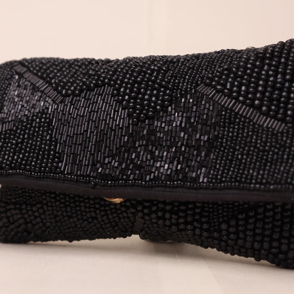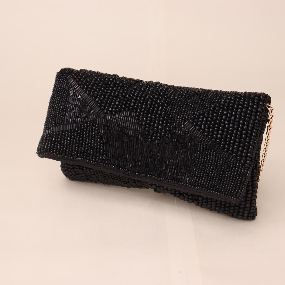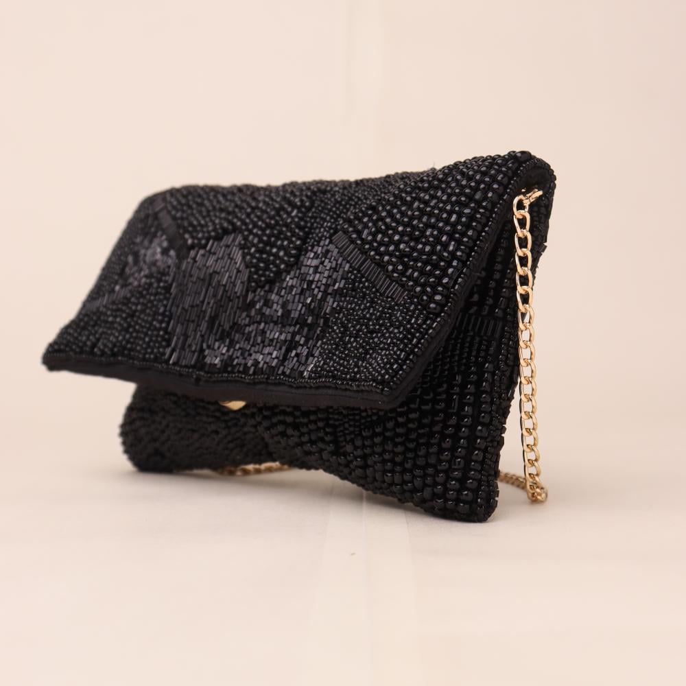 Exude elegance with this handcrafted black beaded clutch designed for nights that demand timeless sophistication. Covered in shimmering beads and seedwork, this statement sling bag features a sleek flap design, golden chain strap, and secure magnetic closure. Ideal for parties, weddings, or evening occasions, it’s a go-to accessory for anyone seeking a bold yet classic finishing touch. Carry it as a sling or style it as a clutch — either way, it’s bound to turn heads.