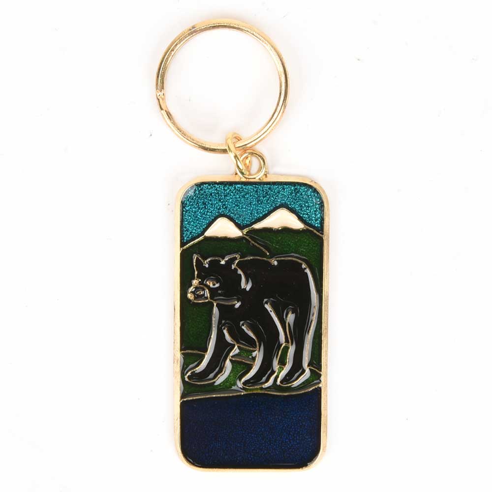 • Black Bear In Forest Brass Key Chain With Snow Clad Mountain