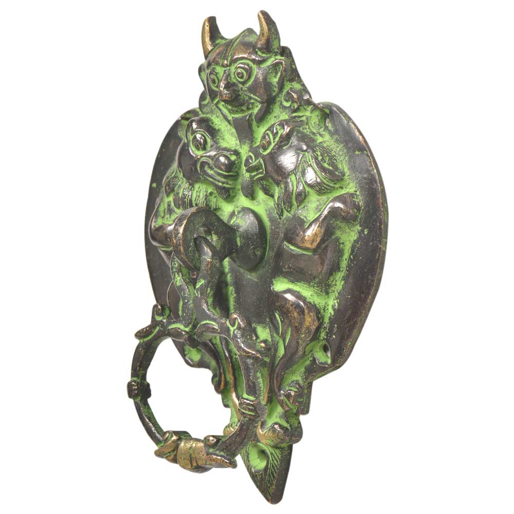 Black Brass Green Patina Demon Head With Two Lion Figurines Door Knocker
