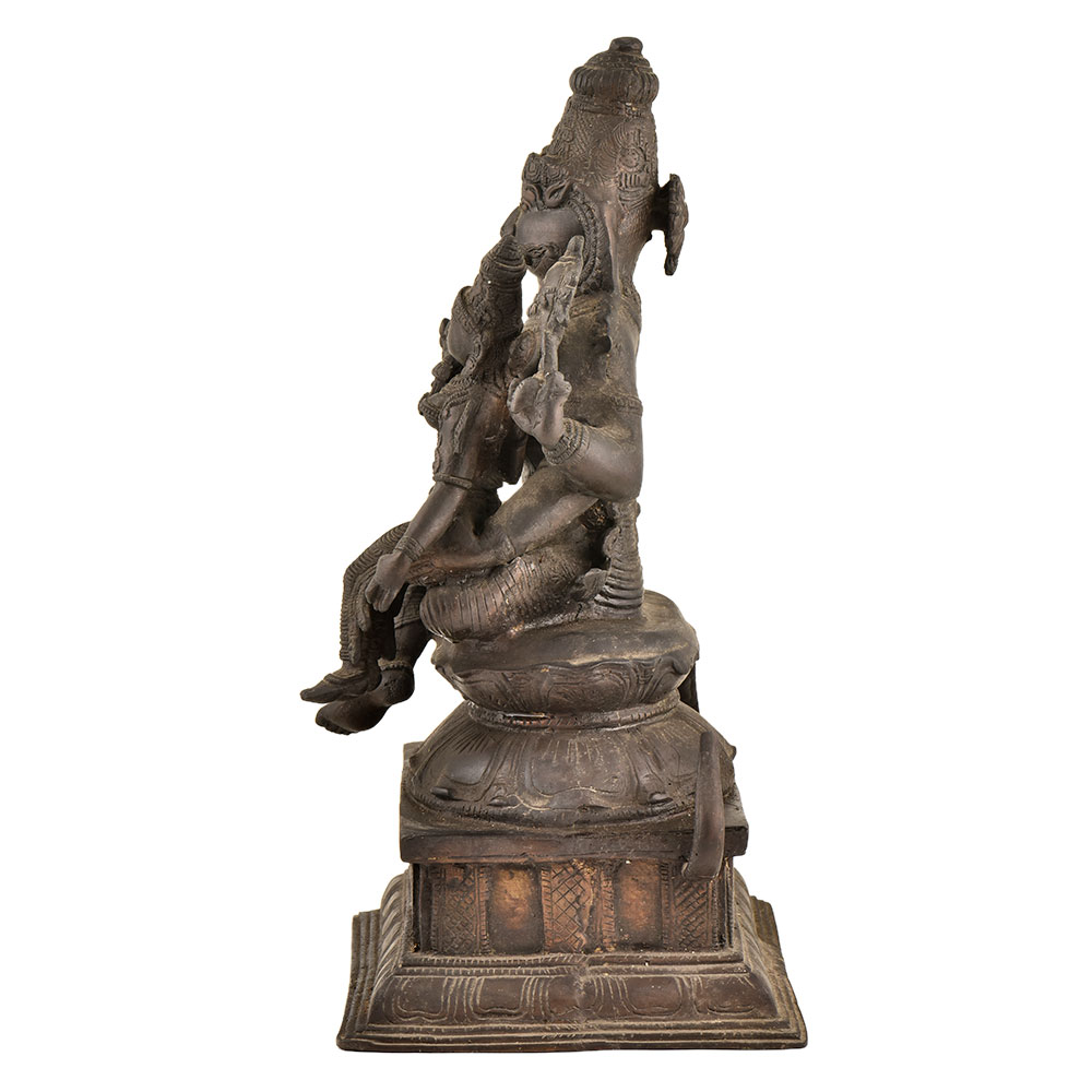 Handmade Lakshmi Narasimha is one of the avatars of Vishnu with Lakshmi on his Lap is an Ideal home decor product and also a great collectable. Lord Vishnu is shown with four hands the rear hands are shown holding shankh and chakra and the right hand is in abhaya mudra and the left hand is used for holding goddess laxmi as she sits on his lap.